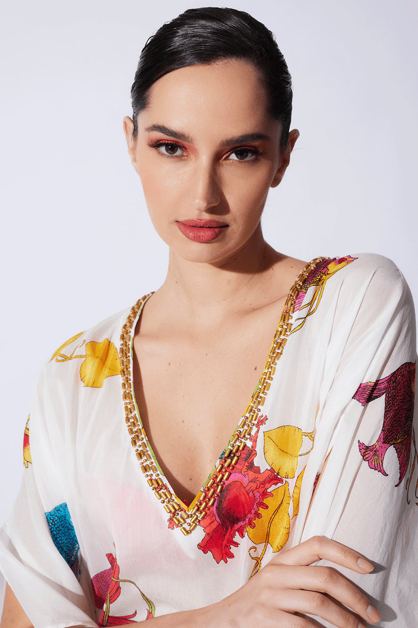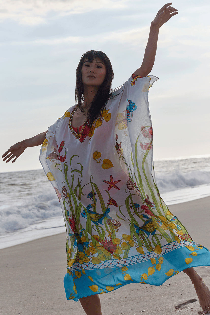 Aquatic Beaded Sheer Caftan - warm white multi