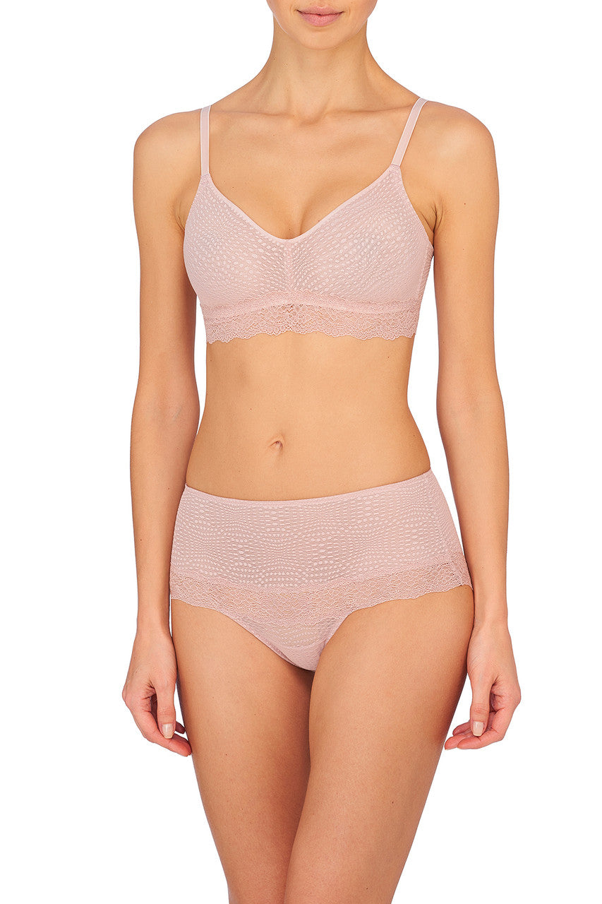 Natori's signature soft feel now offered in an everyday convertible wireless bra. Innovative moldable lace is paired with Natori exclusive floral lace to offer a romantic look and comfortable feel.