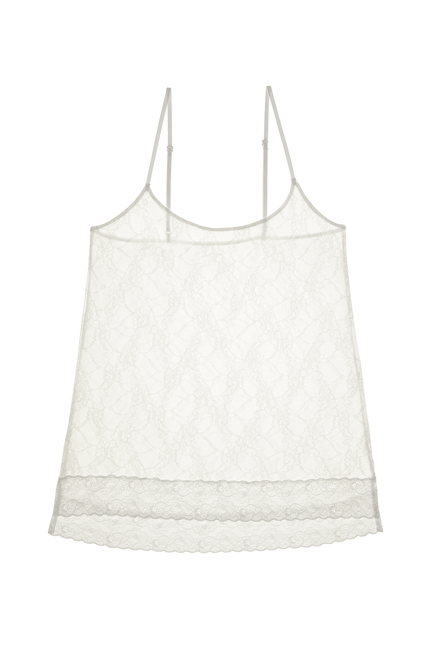 - A slight high-low split hem with skin-soft lace trim