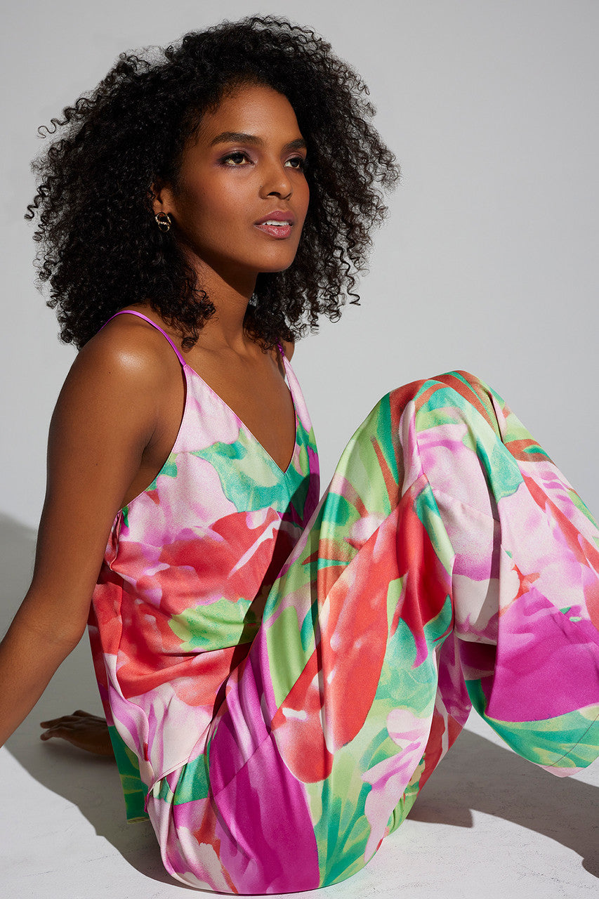 Painterly florals come to life on printed satin.