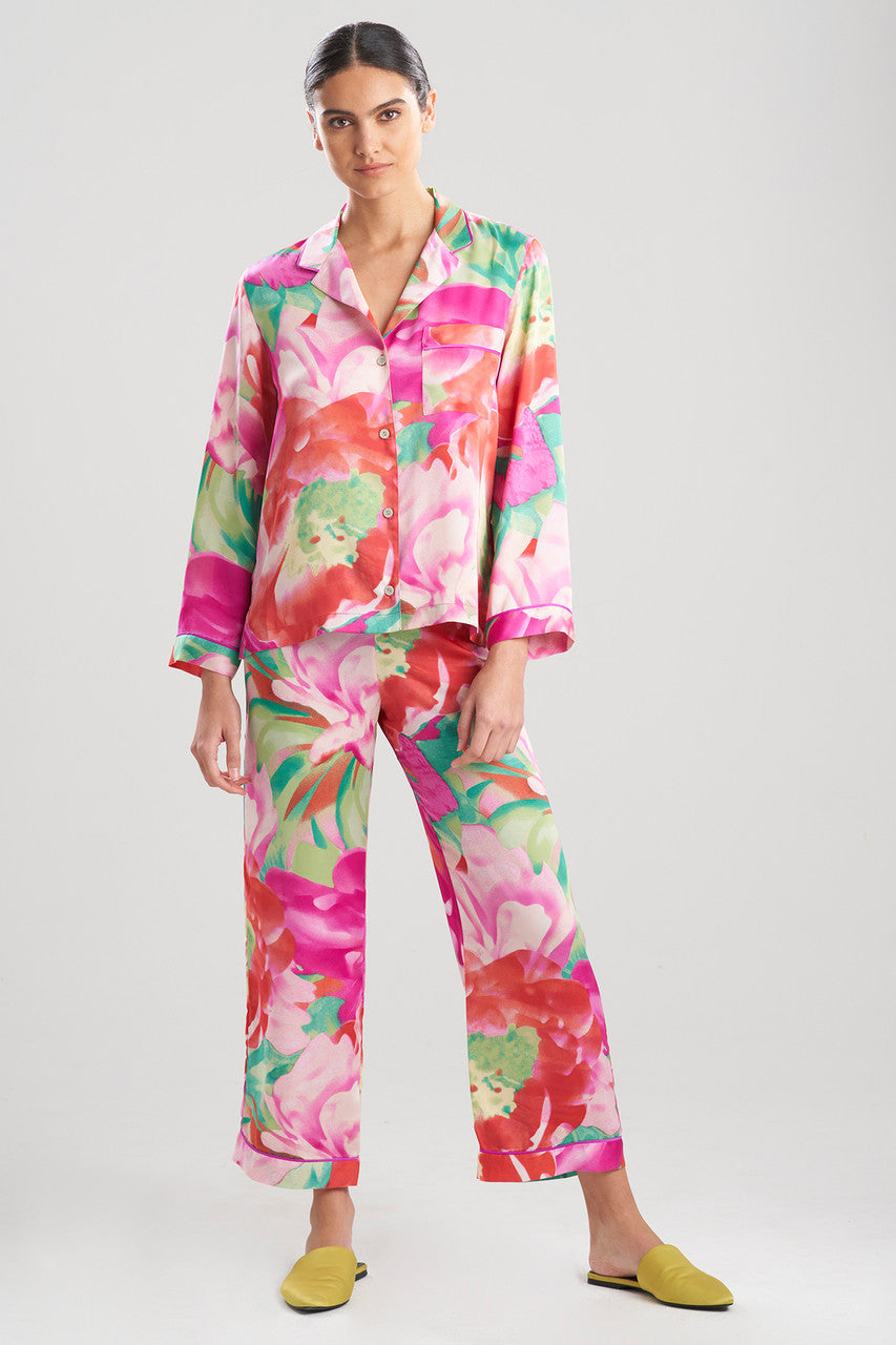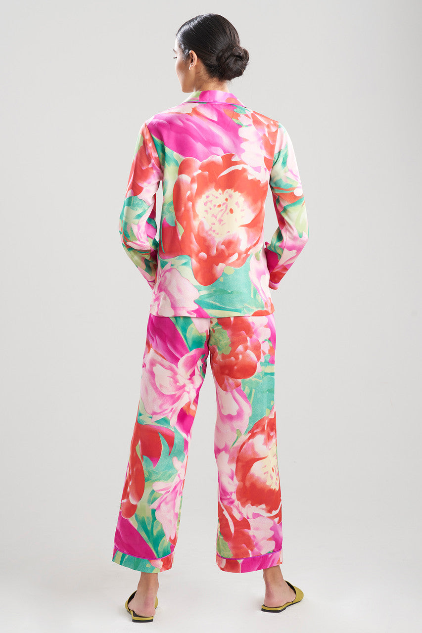 Painterly florals come to life on printed satin.