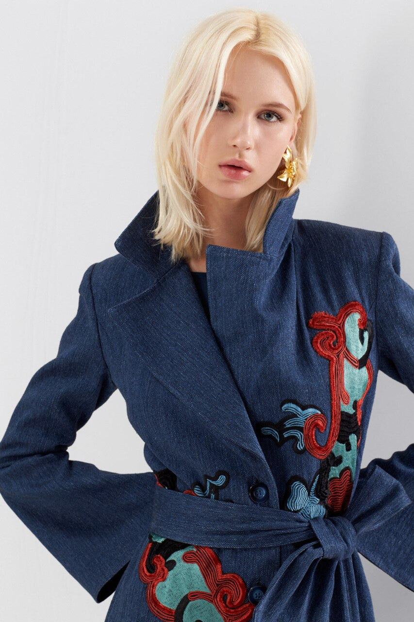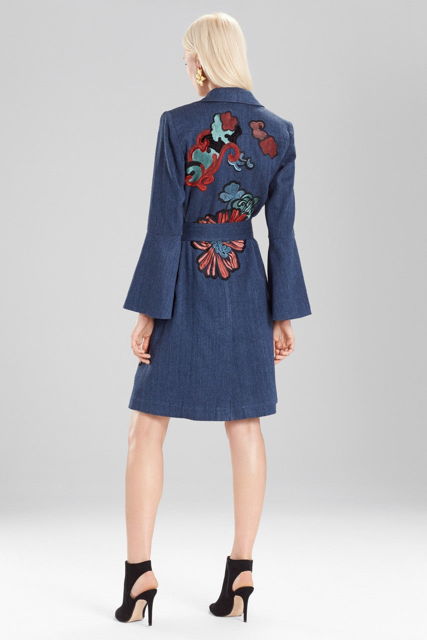 Elevate your denim look with intricate floral embroidery, a cinched waist and bell sleeves