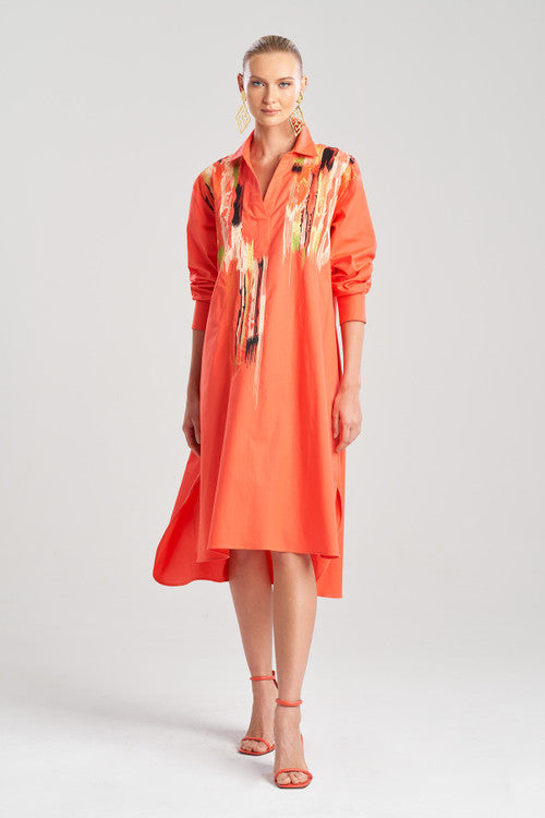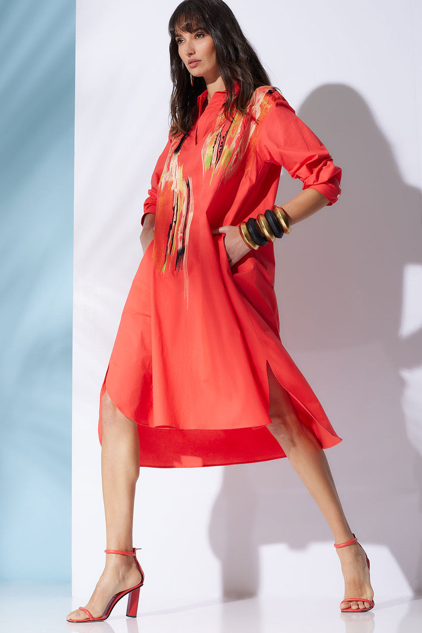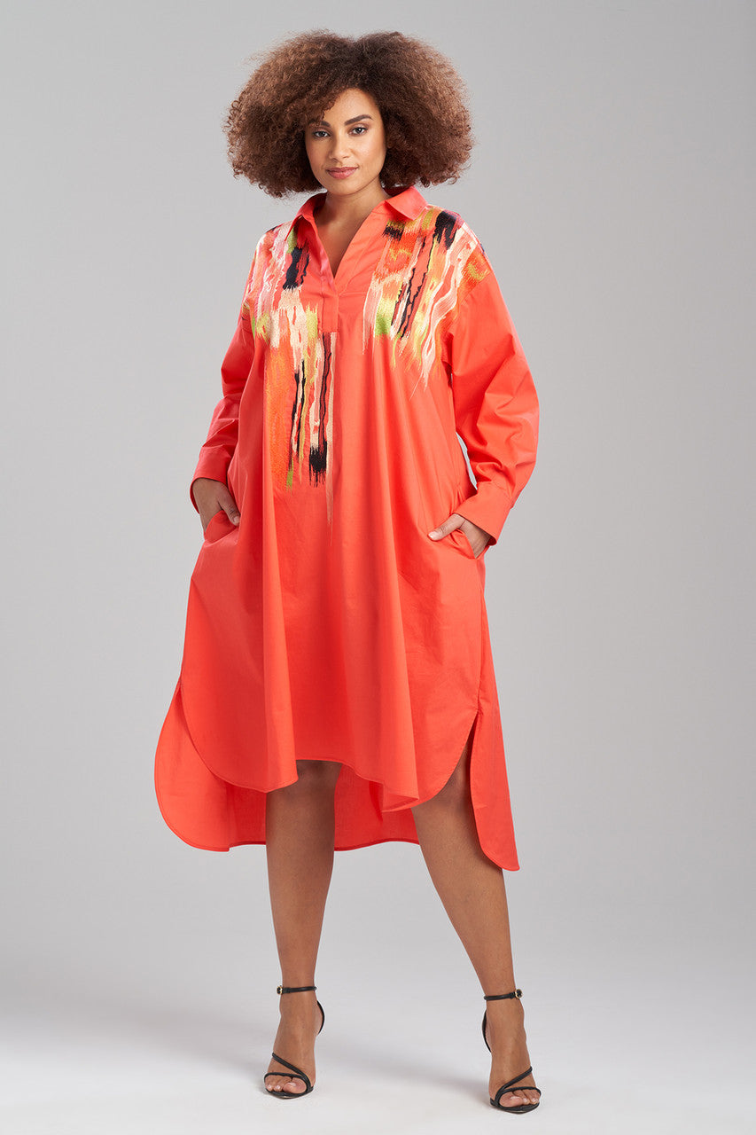 Cotton Poplin Oversized Half Placket Embroidered Shirtdress - coral