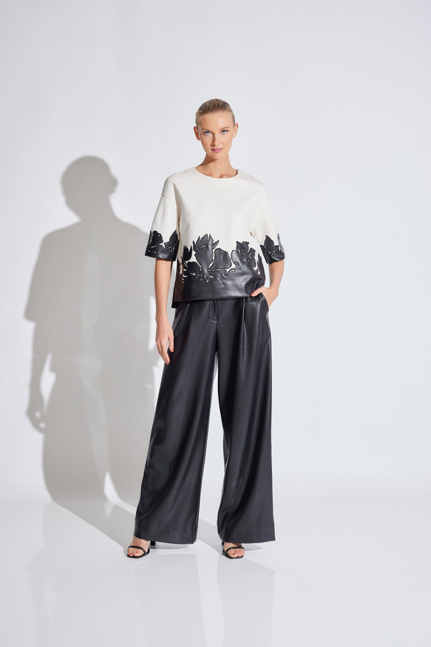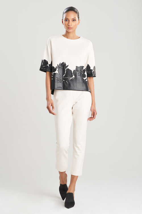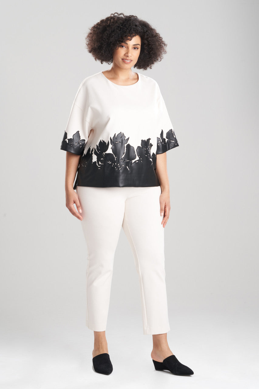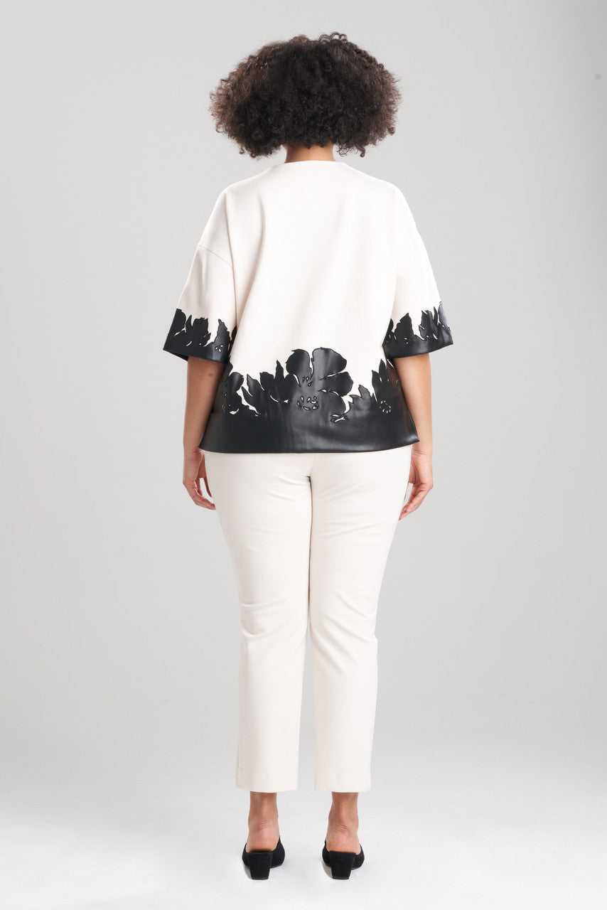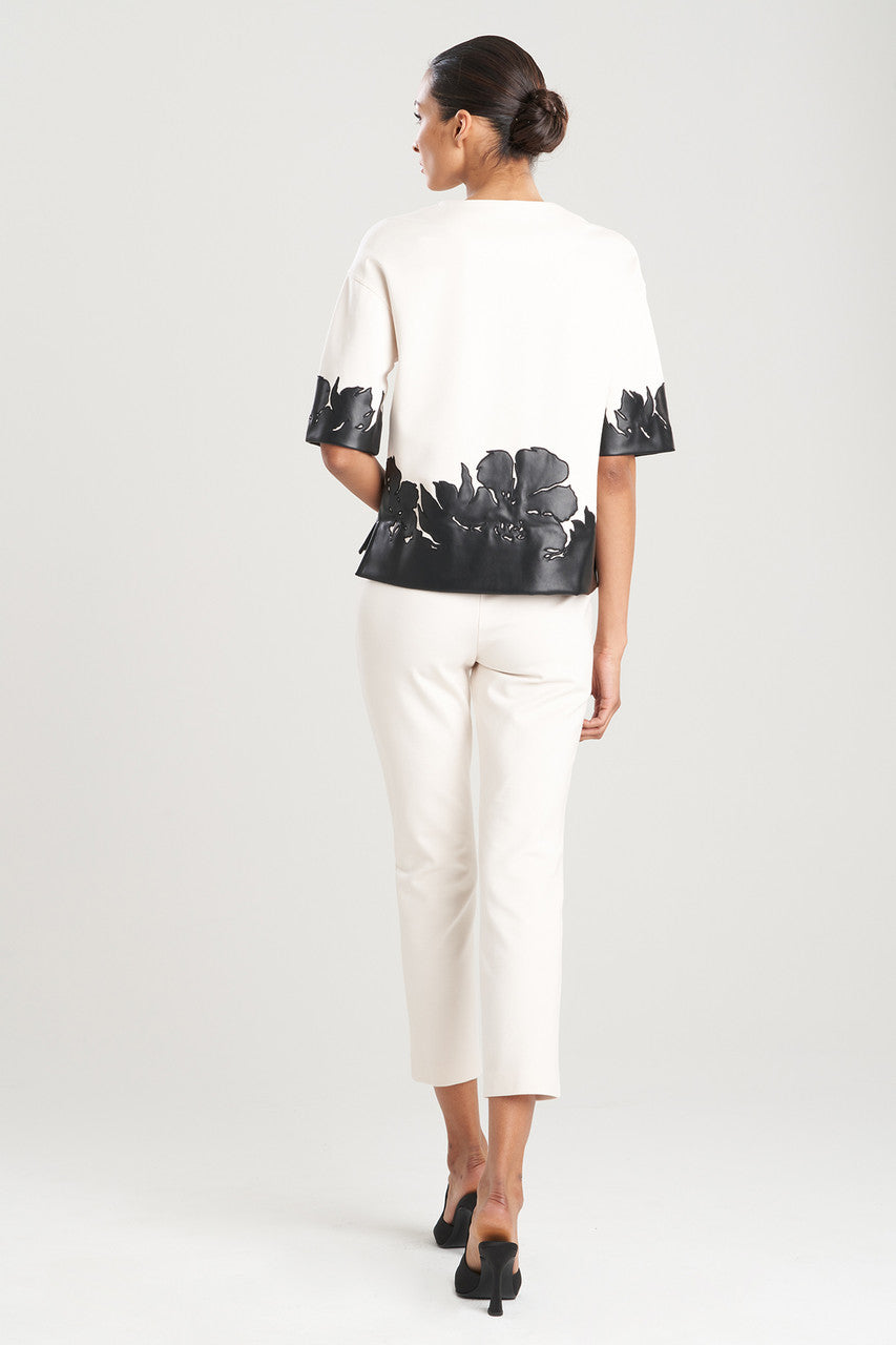 Timeless, fine double knit fabric with 100% vegan leather appliques.