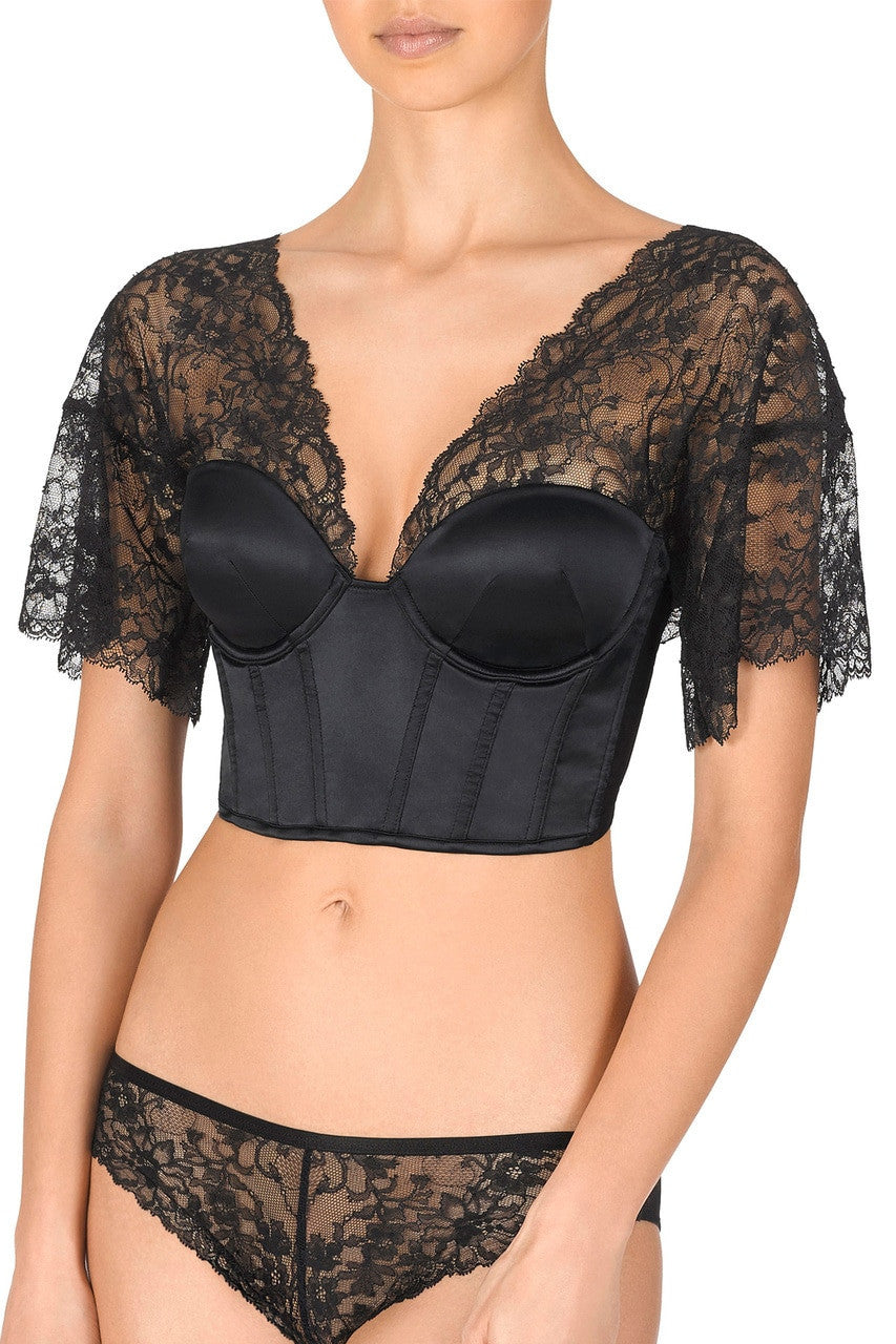 Plunging kimono inspired bustier with delicate Chantilly lace at neckline and sleeves