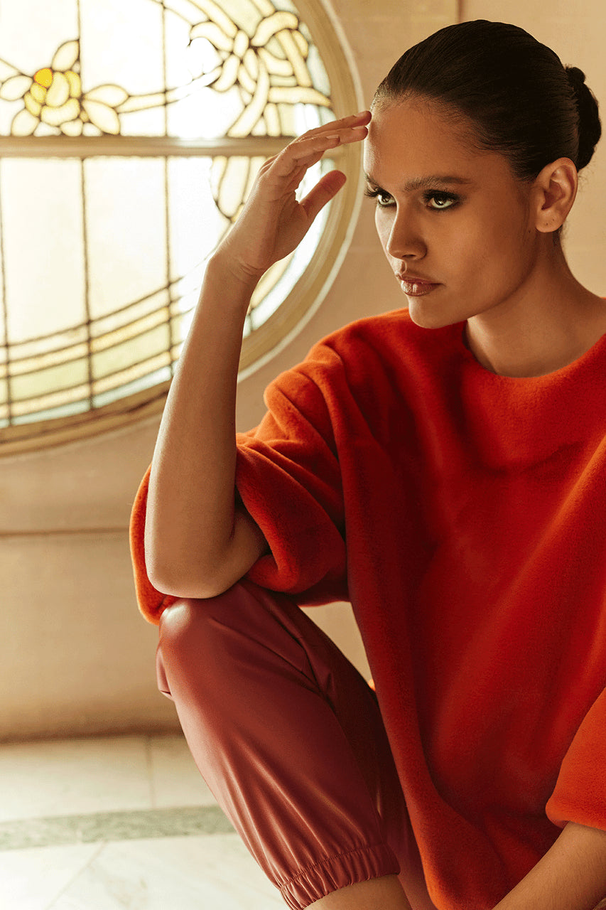 Feel both festive & cozy in eco-friendly faux sheared mink.