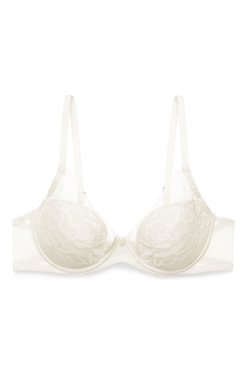 Innovative molded, floral lace overlays smooth cups for a seamless edge that disappears completely under clothes.