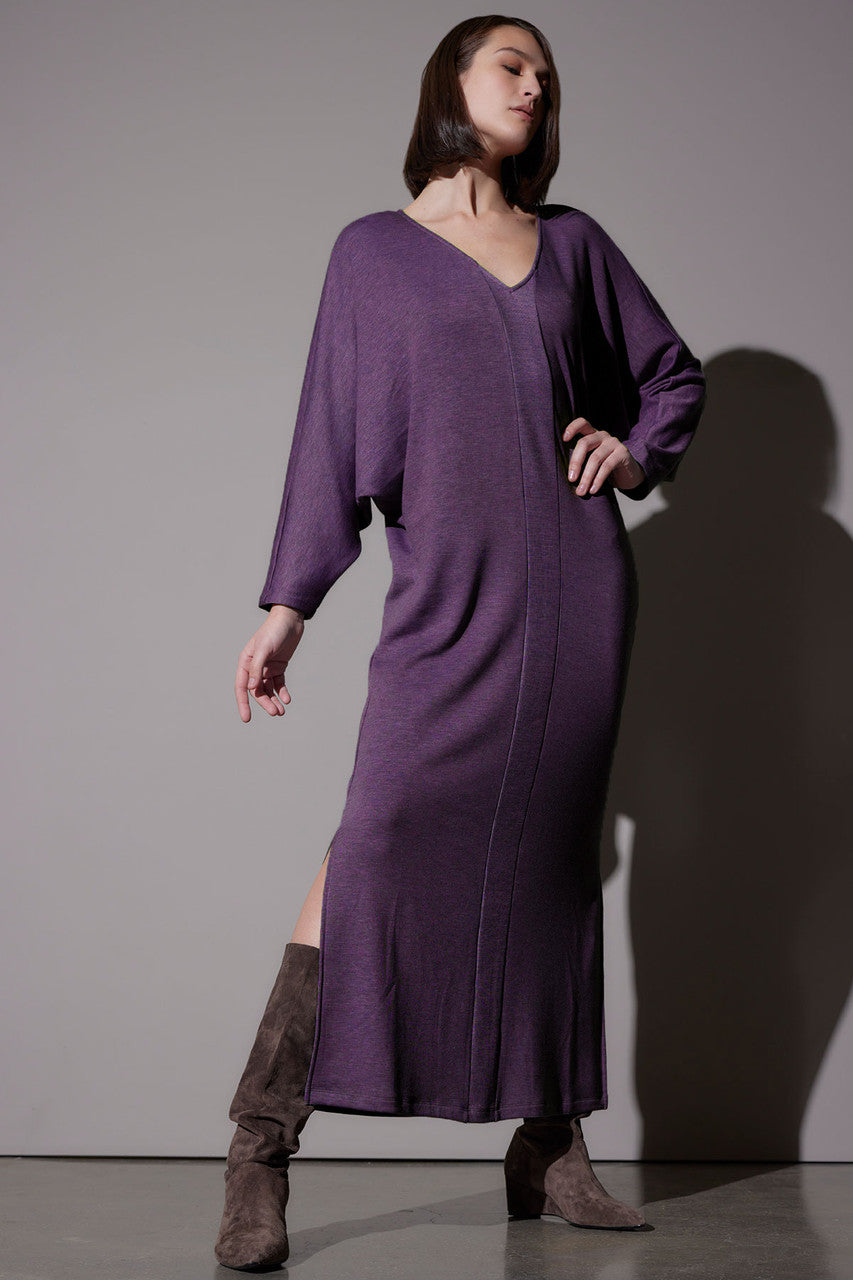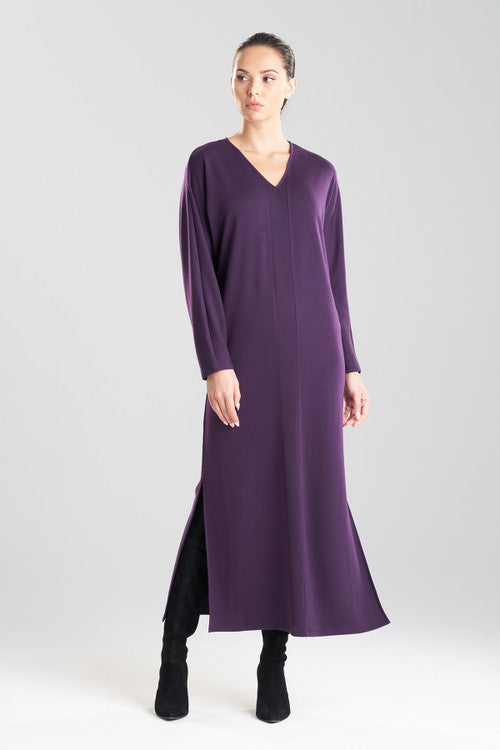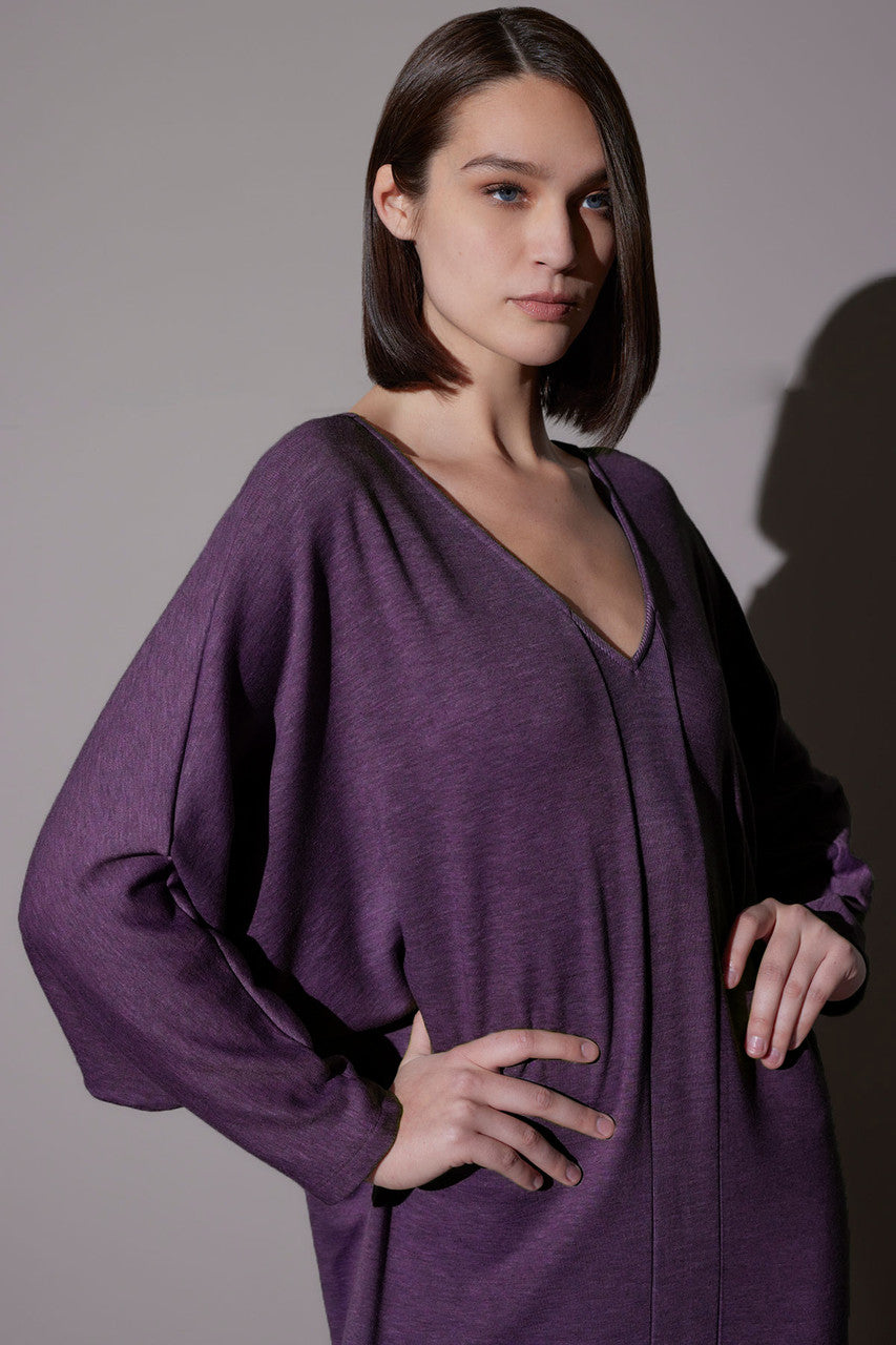 • Relaxed and comfortable wedge shape lounger with v shape neckline, side slits at bottom hem and inserted rib detailing at center front