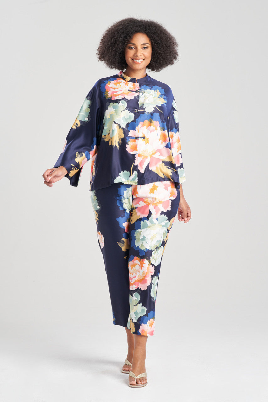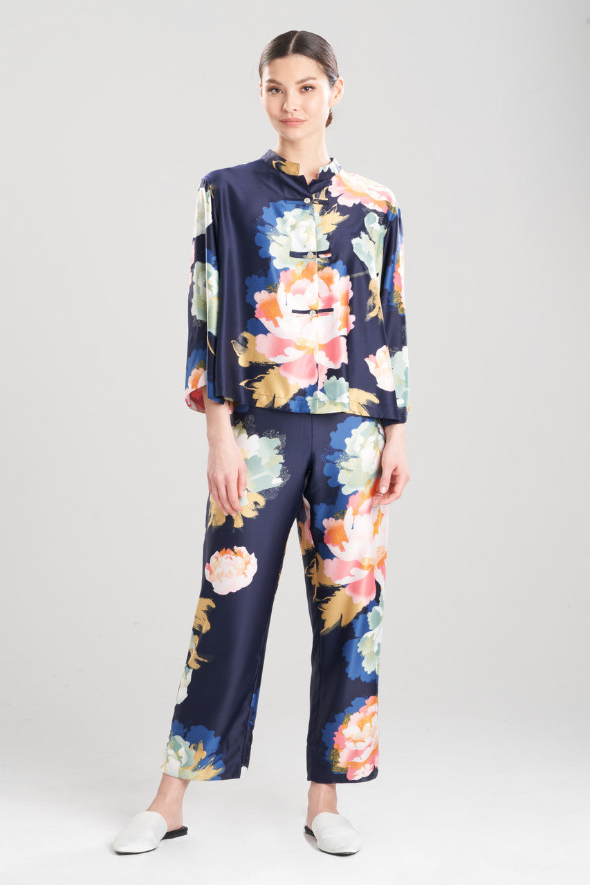 - Relaxed and classic mandarin PJ with a mandarin collar and buttons at center front for closure, paired with a straight leg pant with an elastic waistband and drawstring