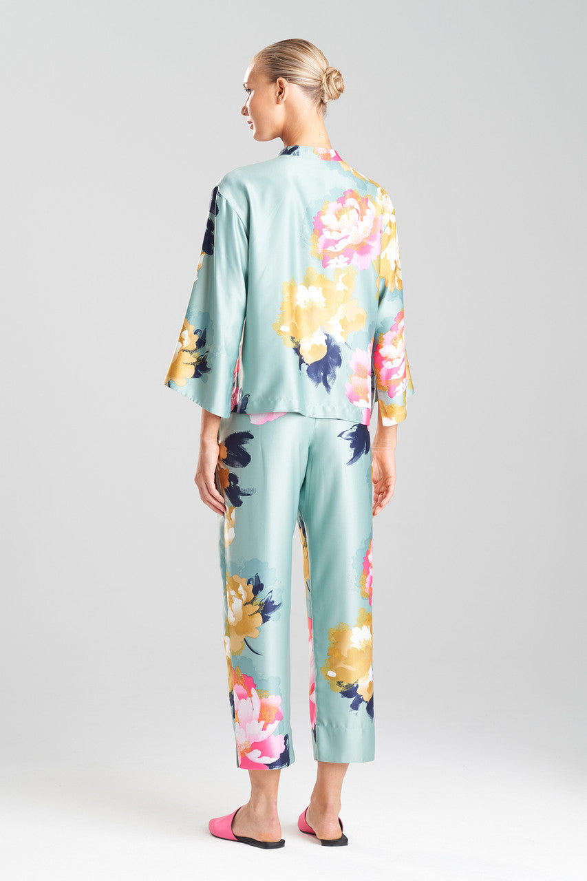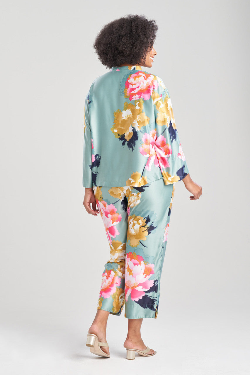 - Relaxed and classic mandarin PJ with a mandarin collar and buttons at center front for closure, paired with a straight leg pant with an elastic waistband and drawstring