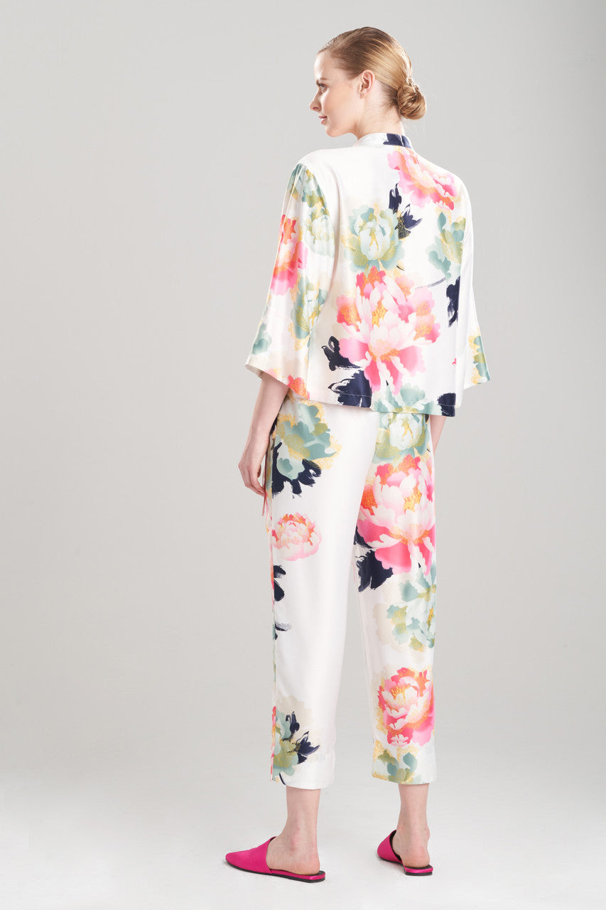 - Relaxed and classic mandarin PJ with a mandarin collar and buttons at center front for closure, paired with a straight leg pant with an elastic waistband and drawstring