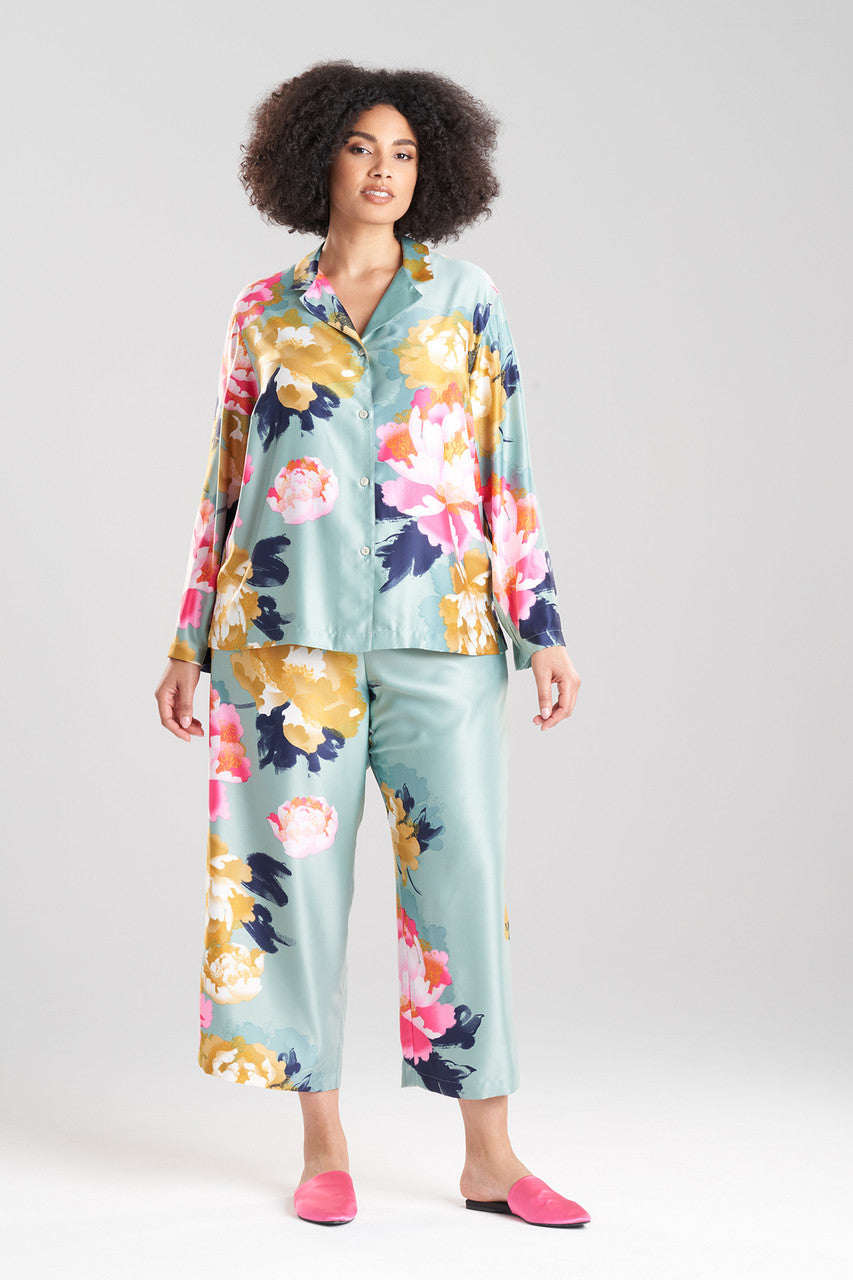 - Our classic notch PJ with buttons at center front for closure and full length sleeves, paired with a straight leg pant with an elastic waistband and drawstring