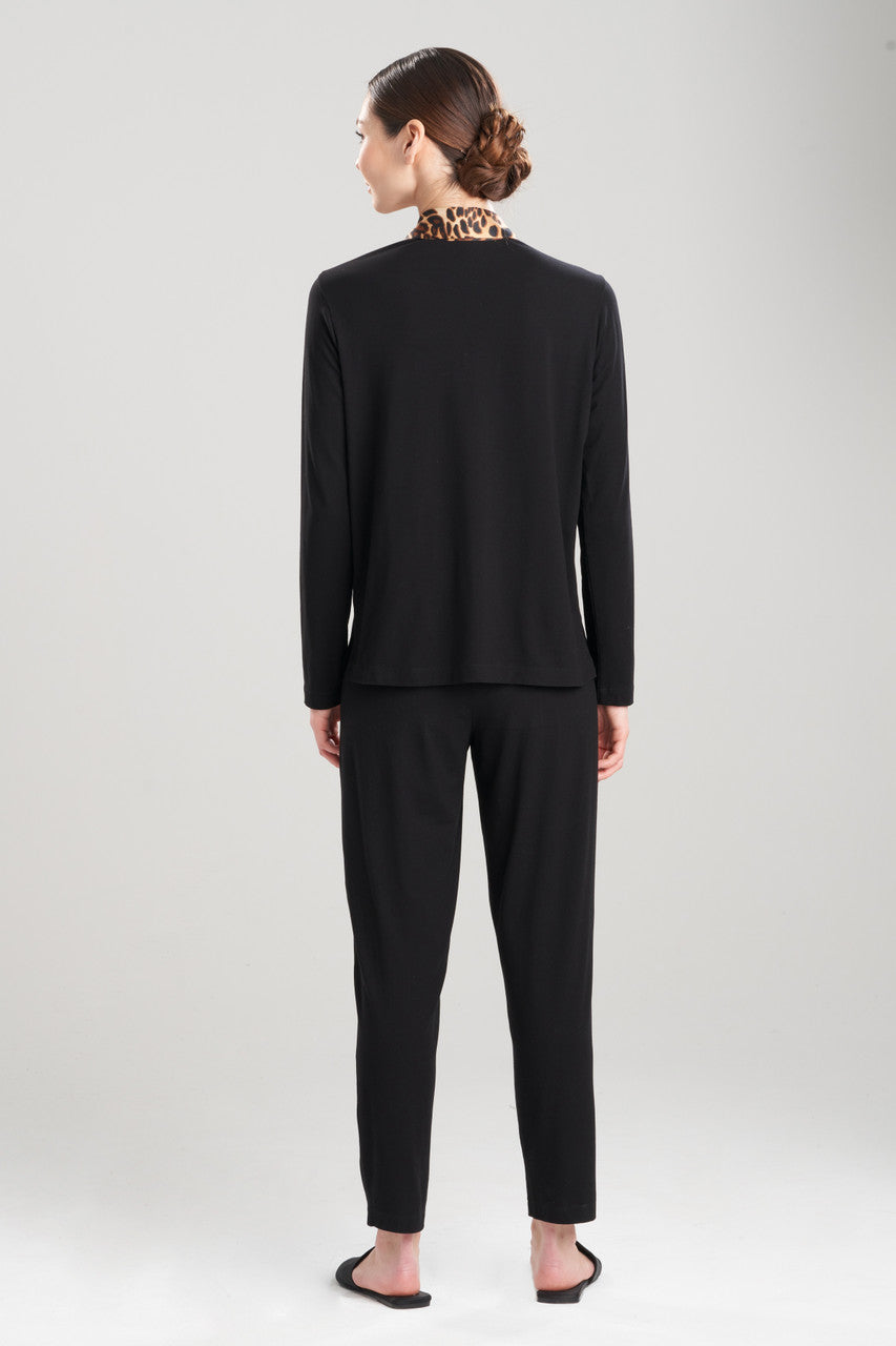 • Comfy and flattering notch PJ with our luxe leopard pattern on the notch collar. Four buttons for closure at center front and paired with a straight let pant, elastic waistband and drawstring