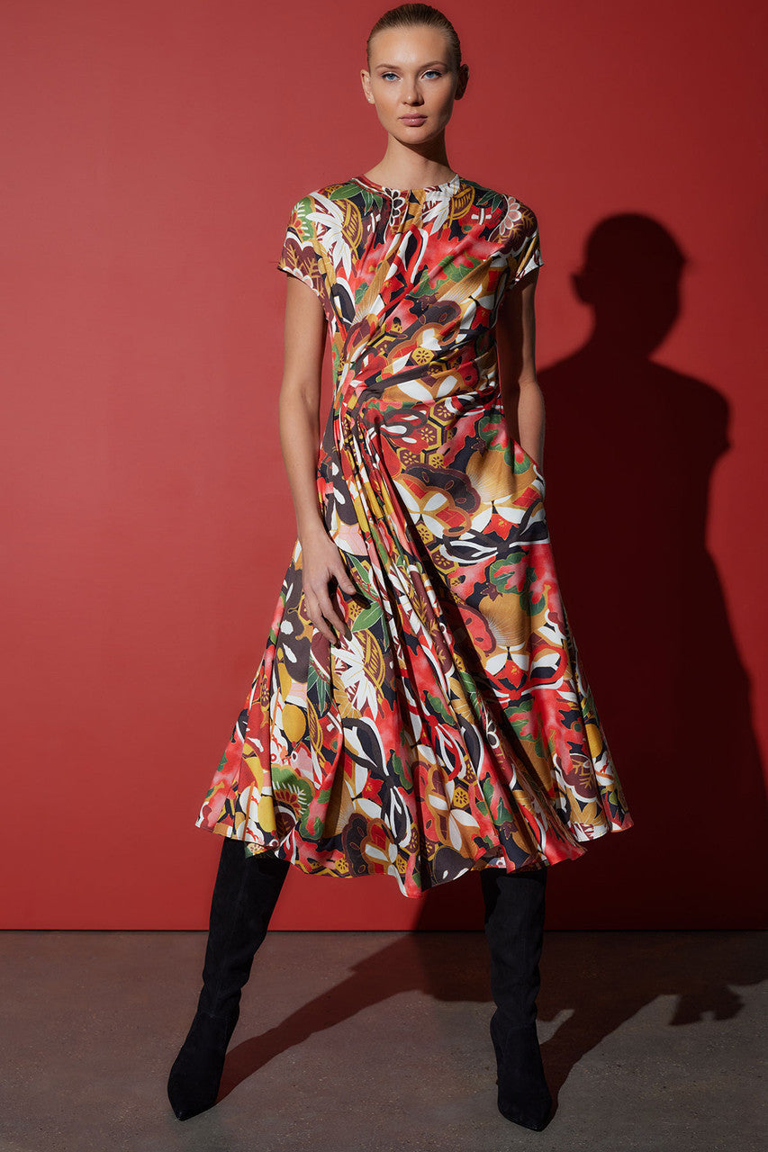 Ikebana Printed Cotton Silk Drape Dress - carnelian
