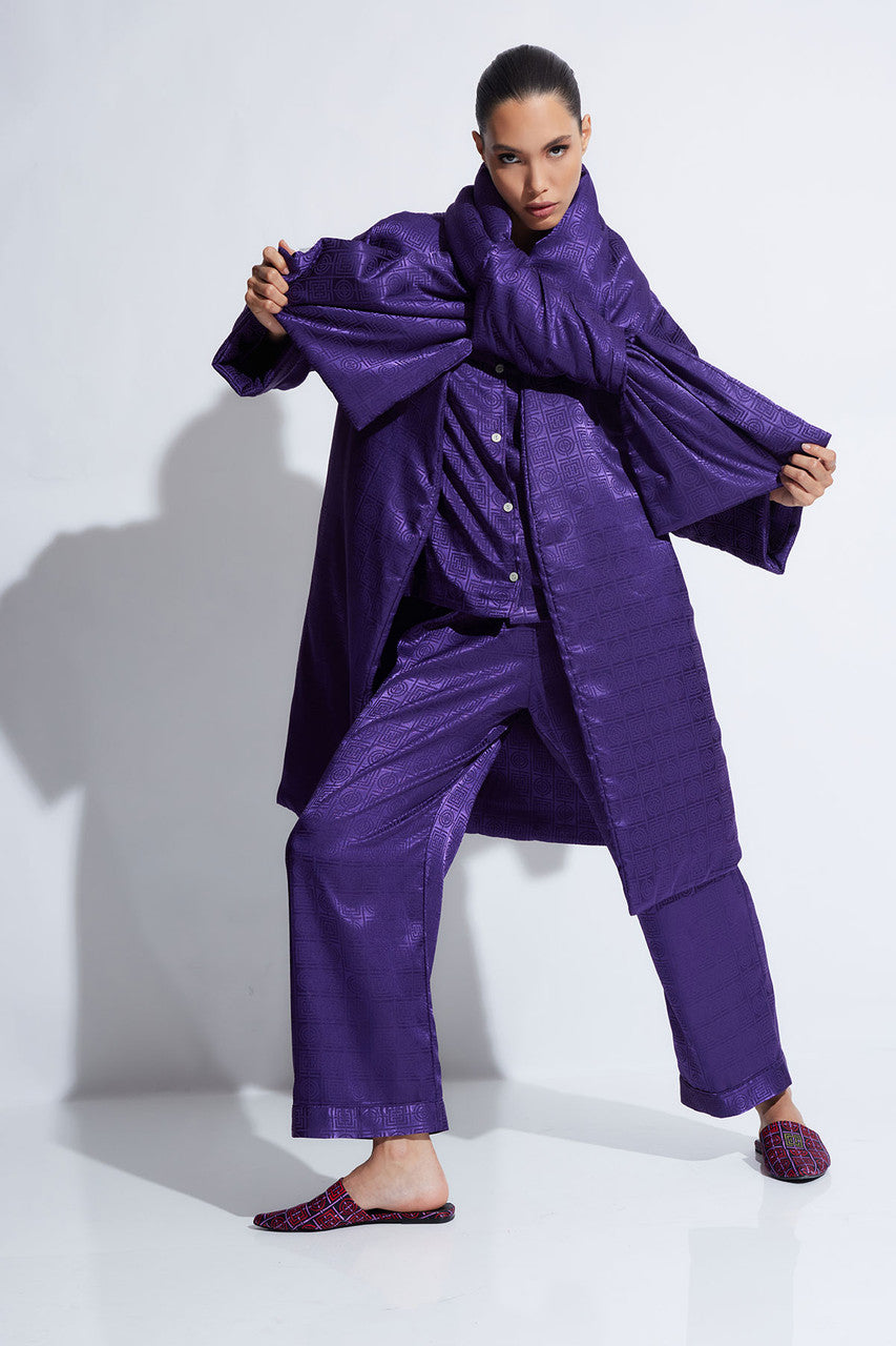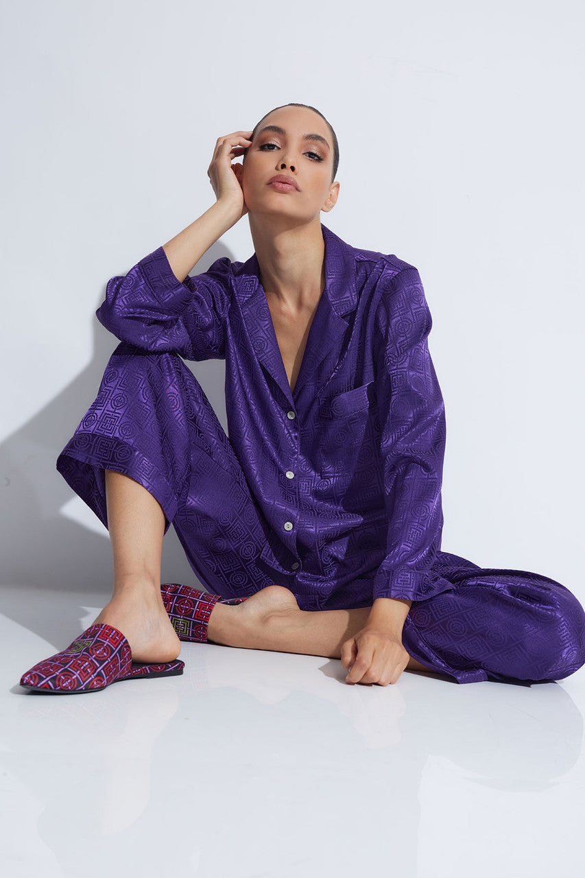 - Classic notch PJ with buttons at center front for closure and full length sleeves, paired with a straight leg pant with an elastic waistband and drawstring