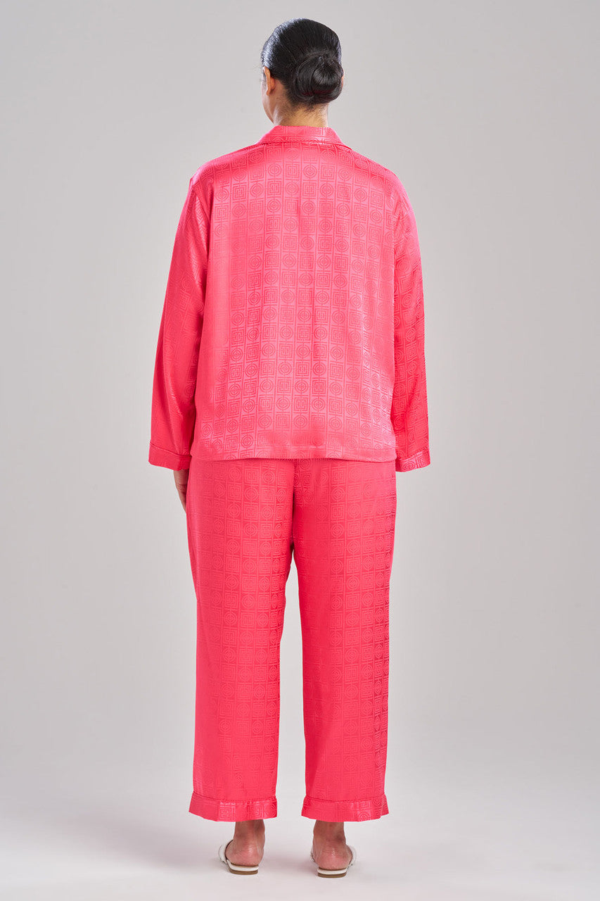 • Classic notch PJ with buttons at center front for closure and full length sleeves, paired with a straight leg pant with an elastic waistband and drawstring