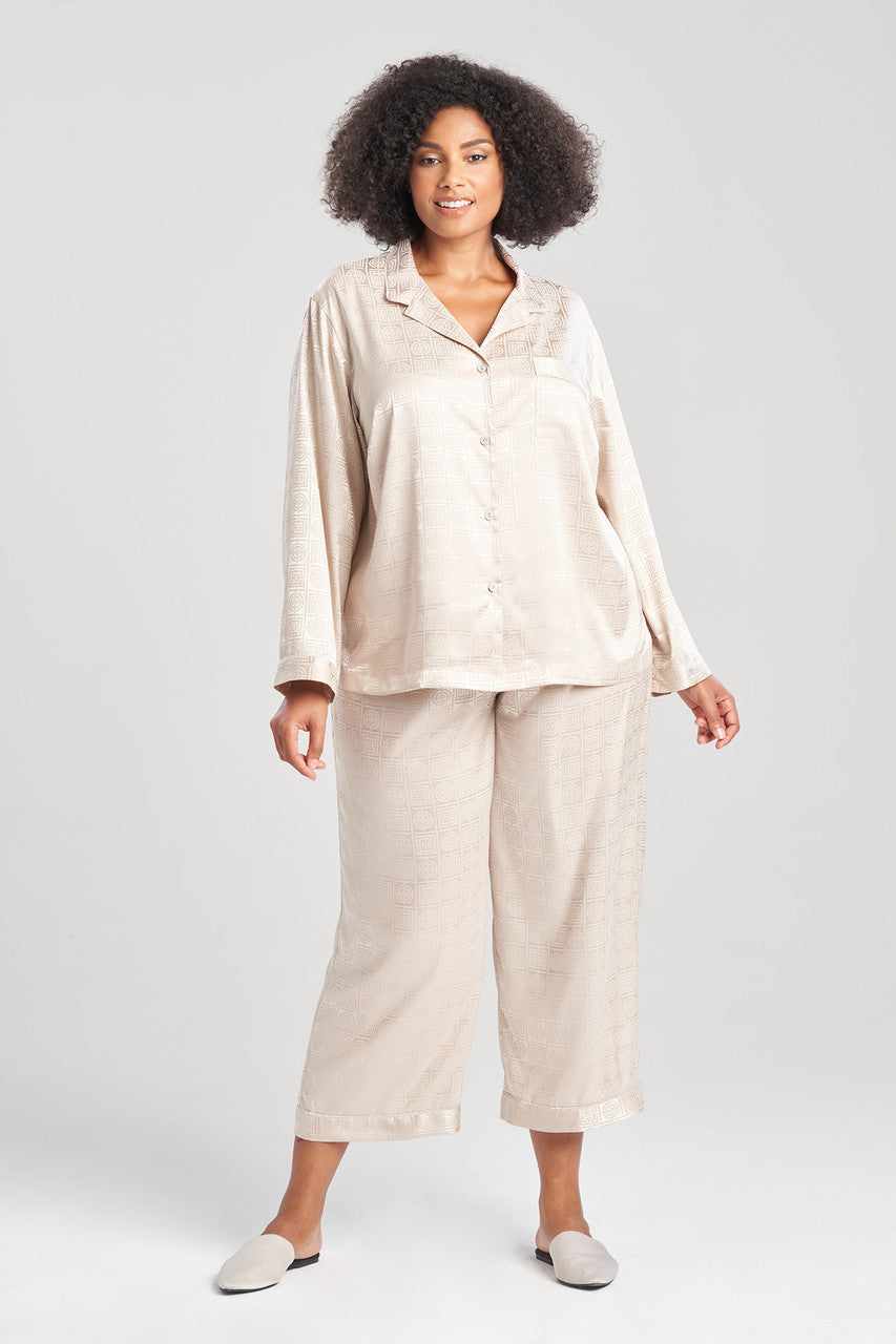 • Classic notch PJ with buttons at center front for closure and full length sleeves, paired with a straight leg pant with an elastic waistband and drawstring