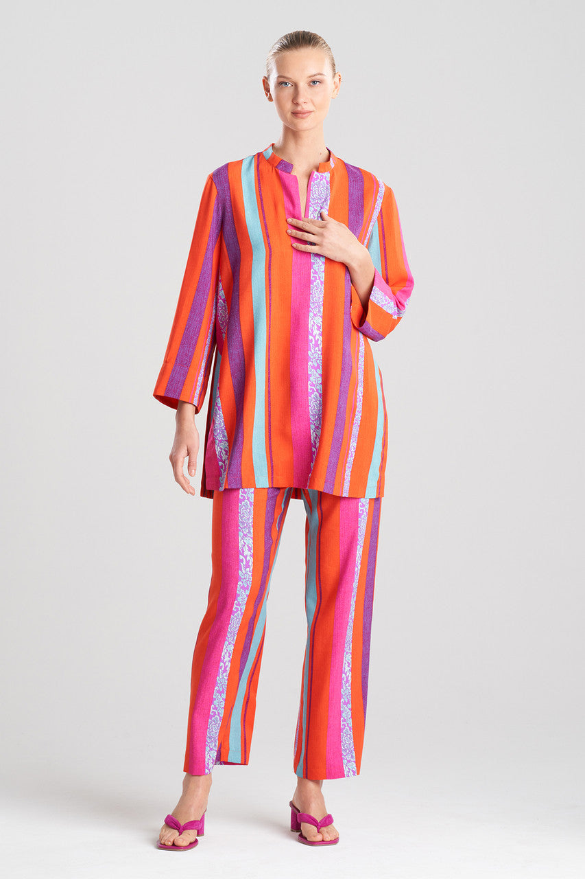 - Relaxed and airy PJ with a mandarin collar, full length sleeves and side slits at bottom hem, paired with a straight leg pant with an elastic waistband and drawstring
