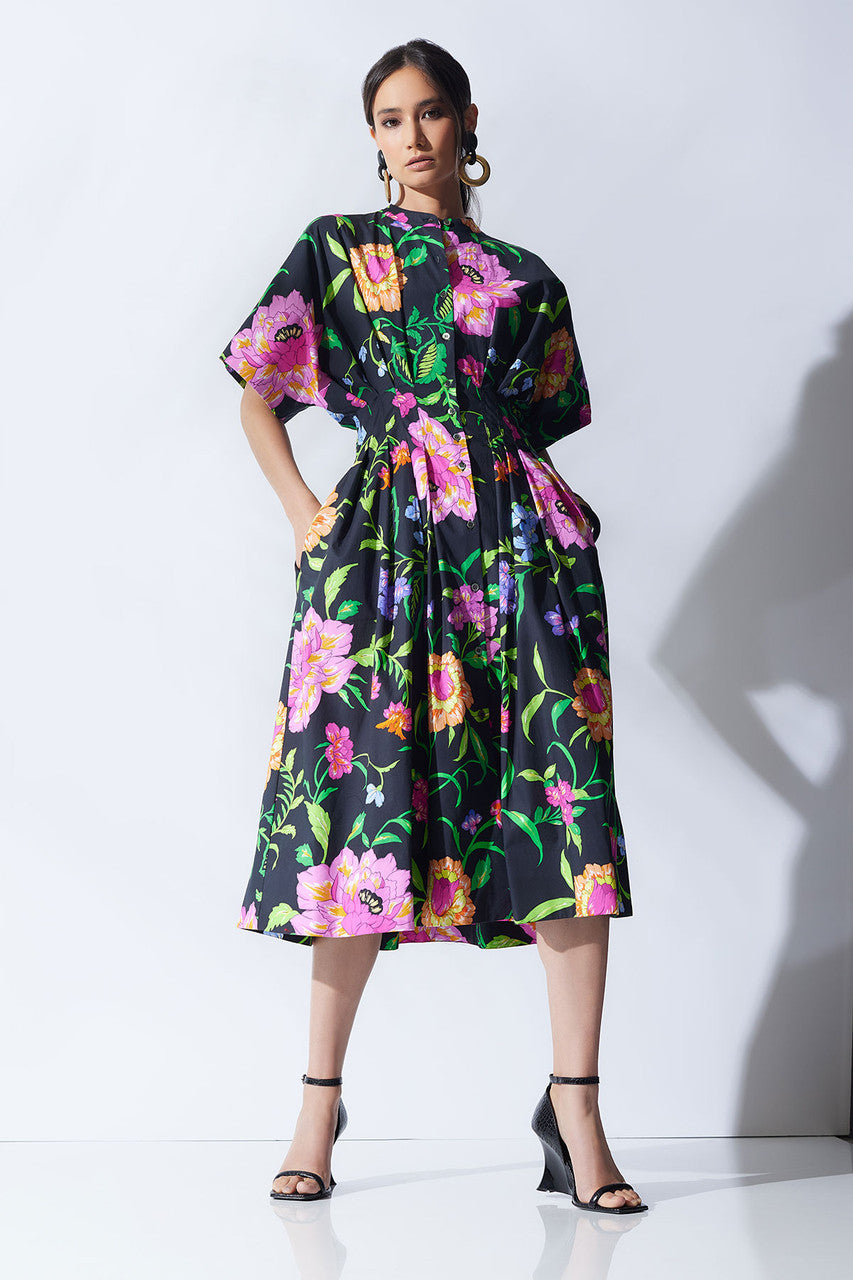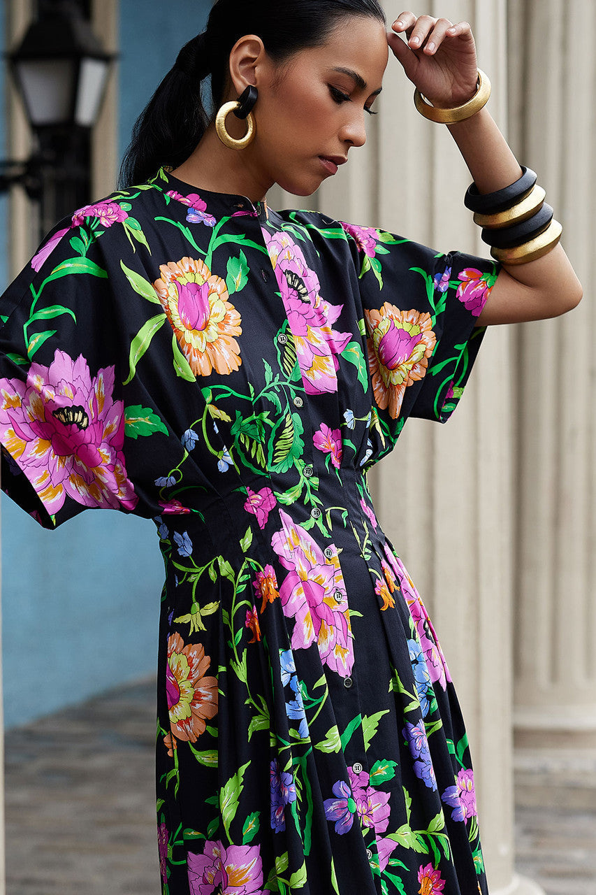 Junko Cotton Poplin Mandarin Dress - black multi