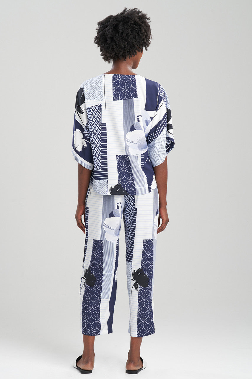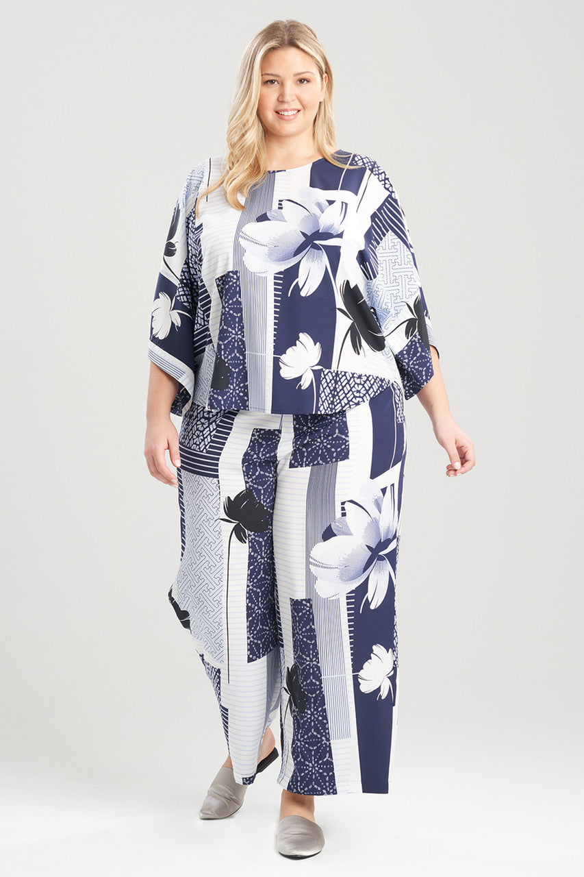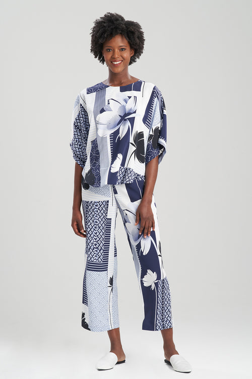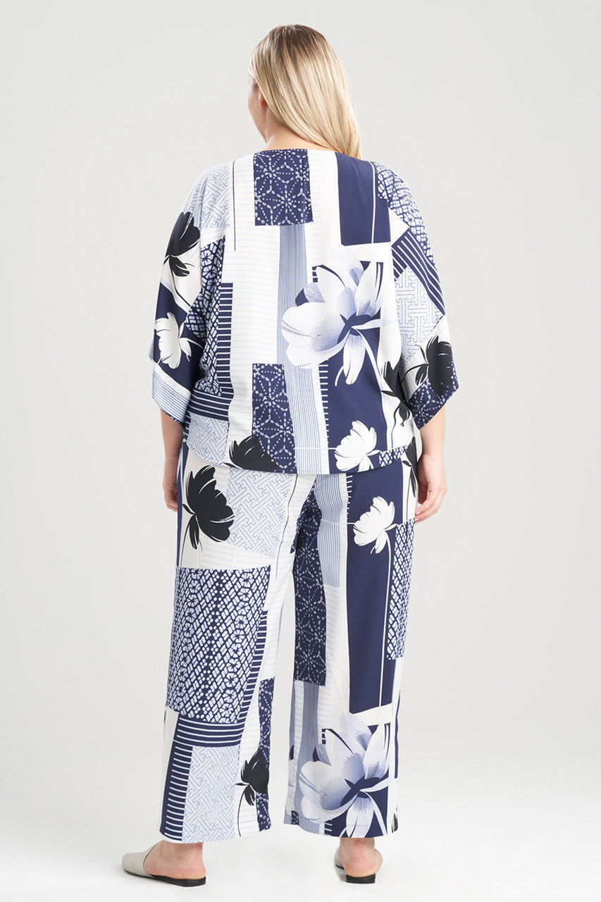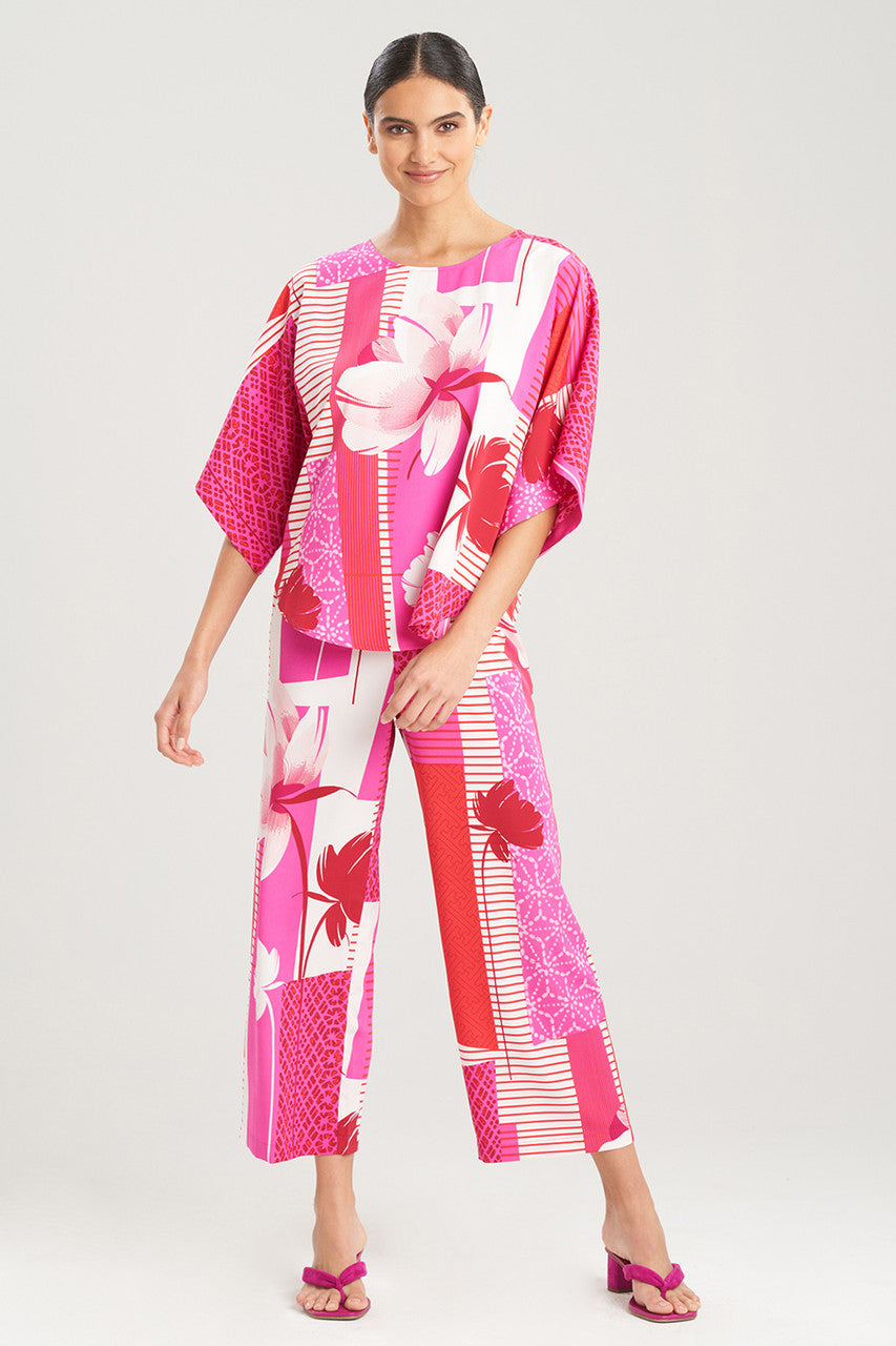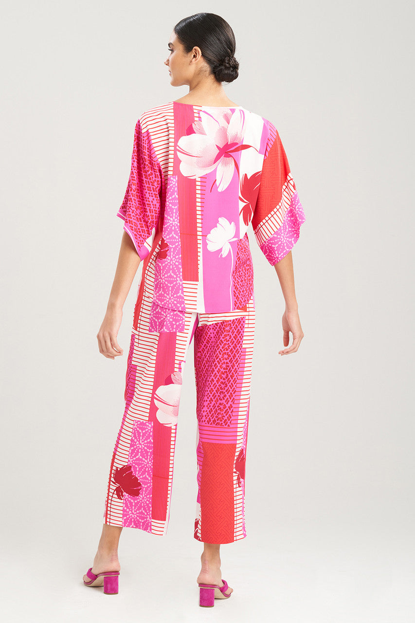 A floral, geo patchwork print. Versatile for every day wear, beachwear or sleepwear.