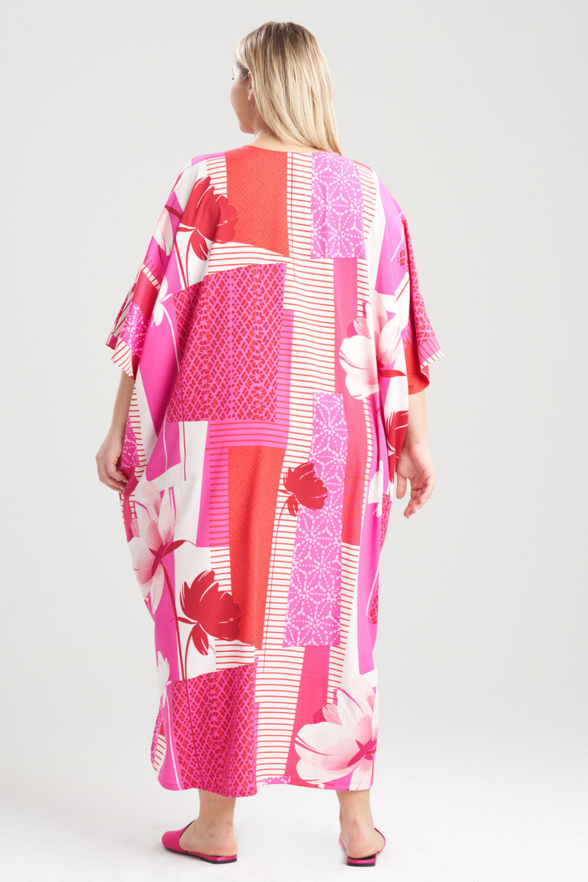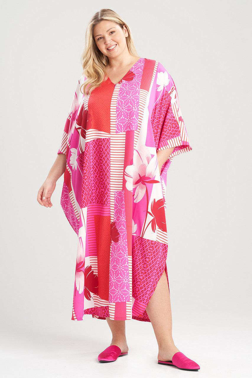 A floral, geo patchwork print. Versatile for every day wear, beachwear or sleepwear.