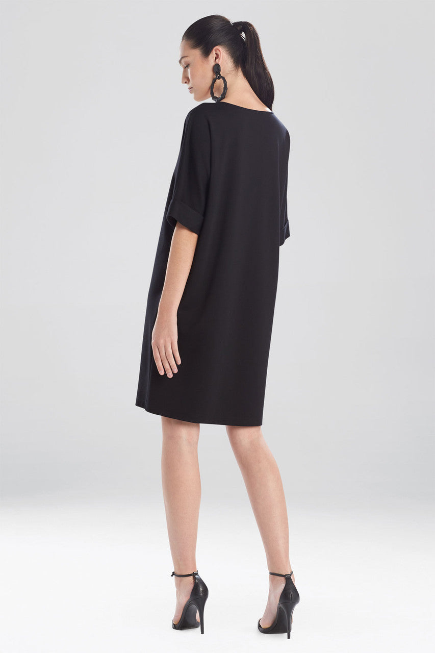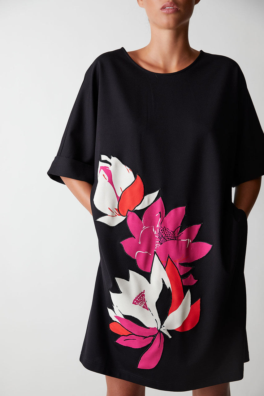 Light Weight Ponte Embroidered T-Shirt Dress - Black