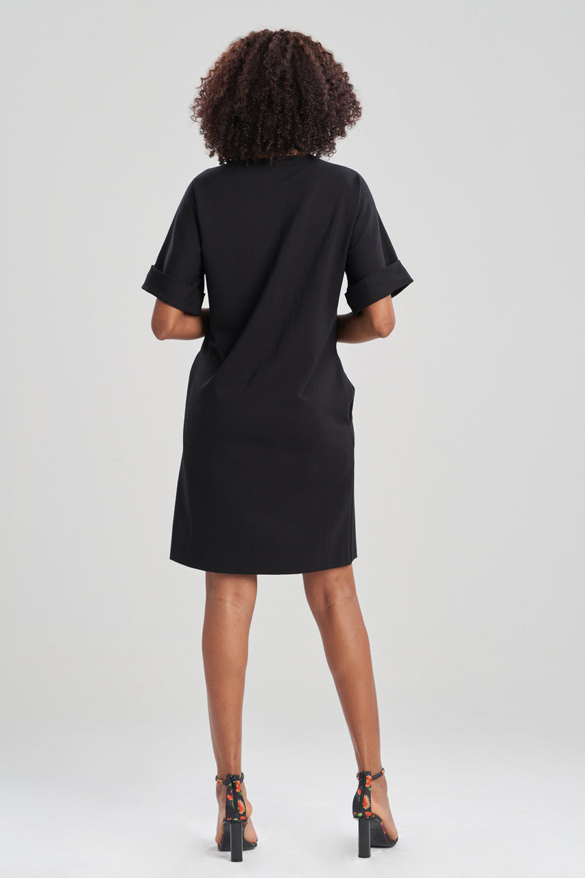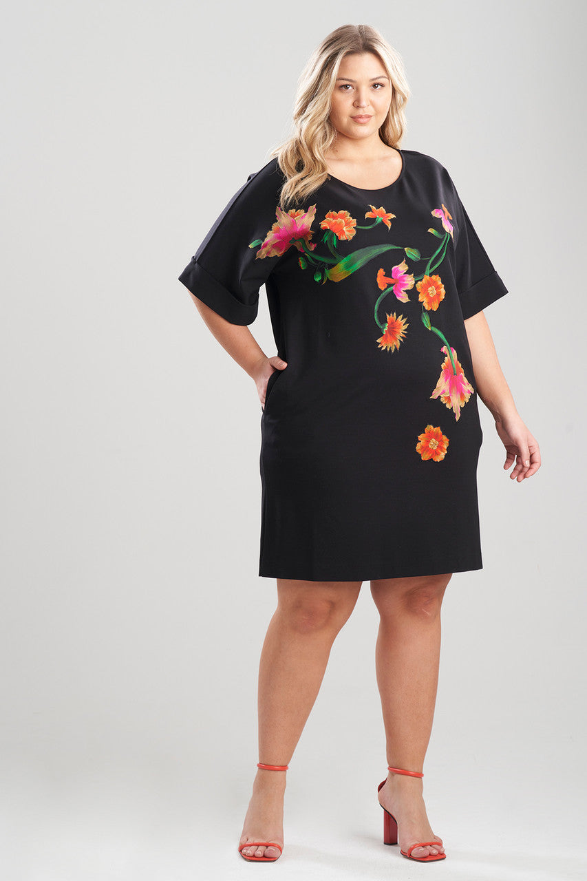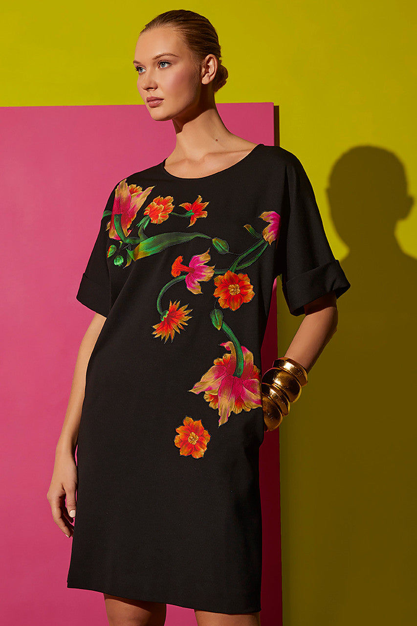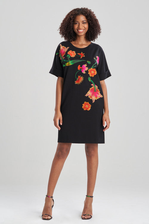 Light Weight Ponte Floral Applique T-Shirt Dress - Black