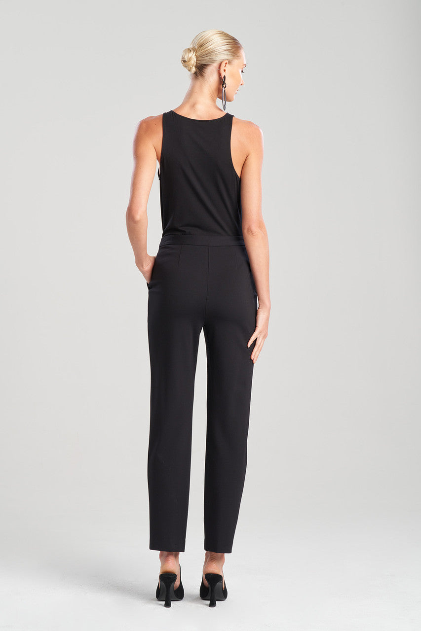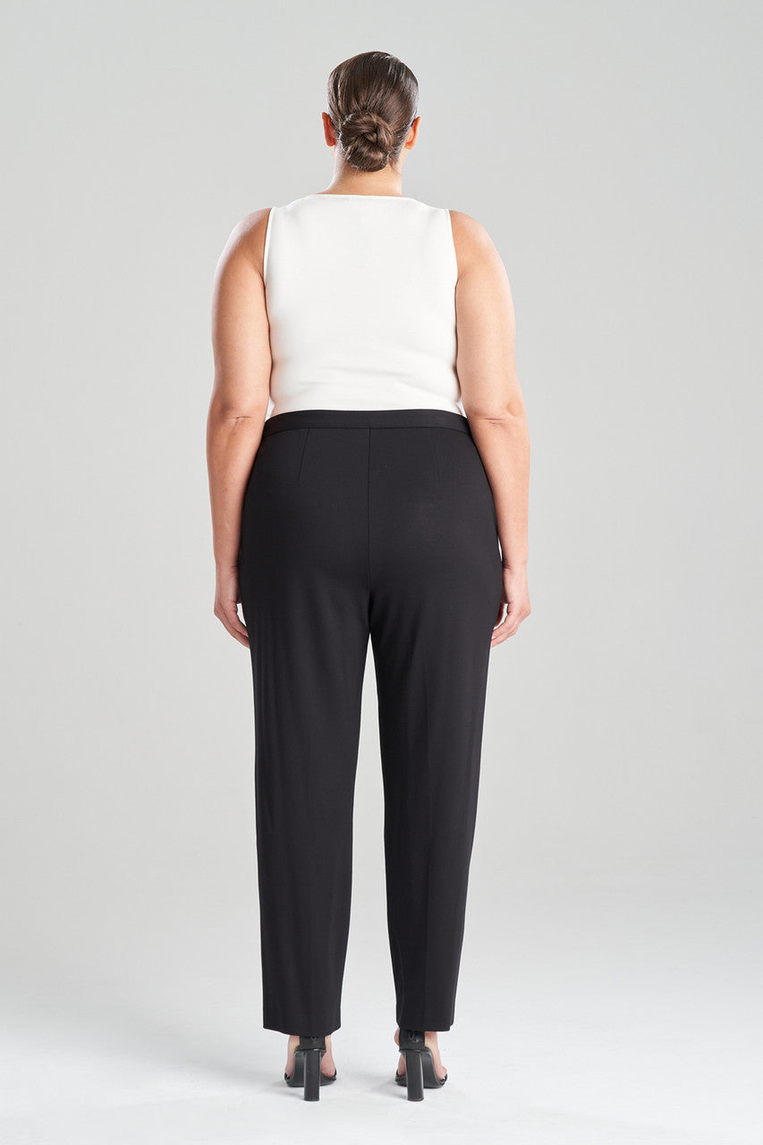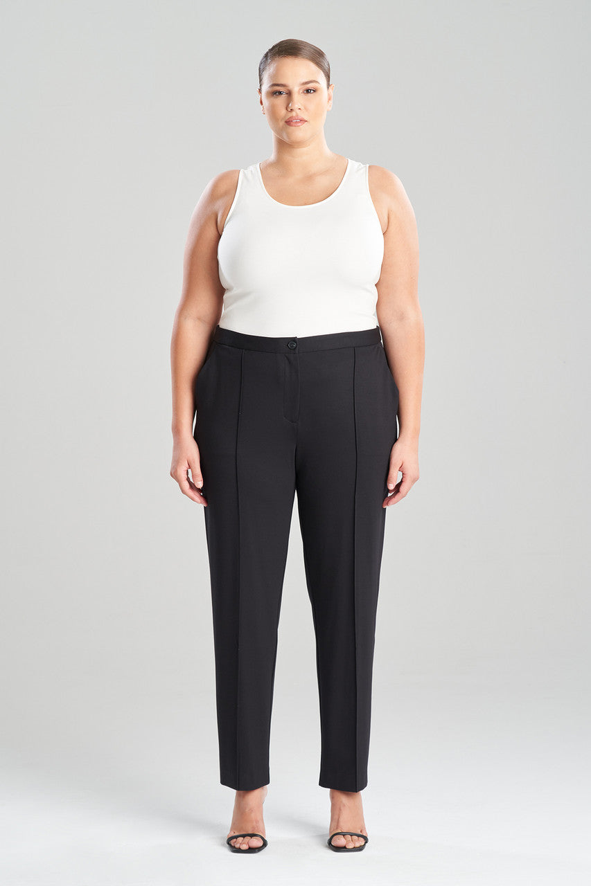 - Metal hook and bar, zipper closure, front facing pockets, darting from back rise