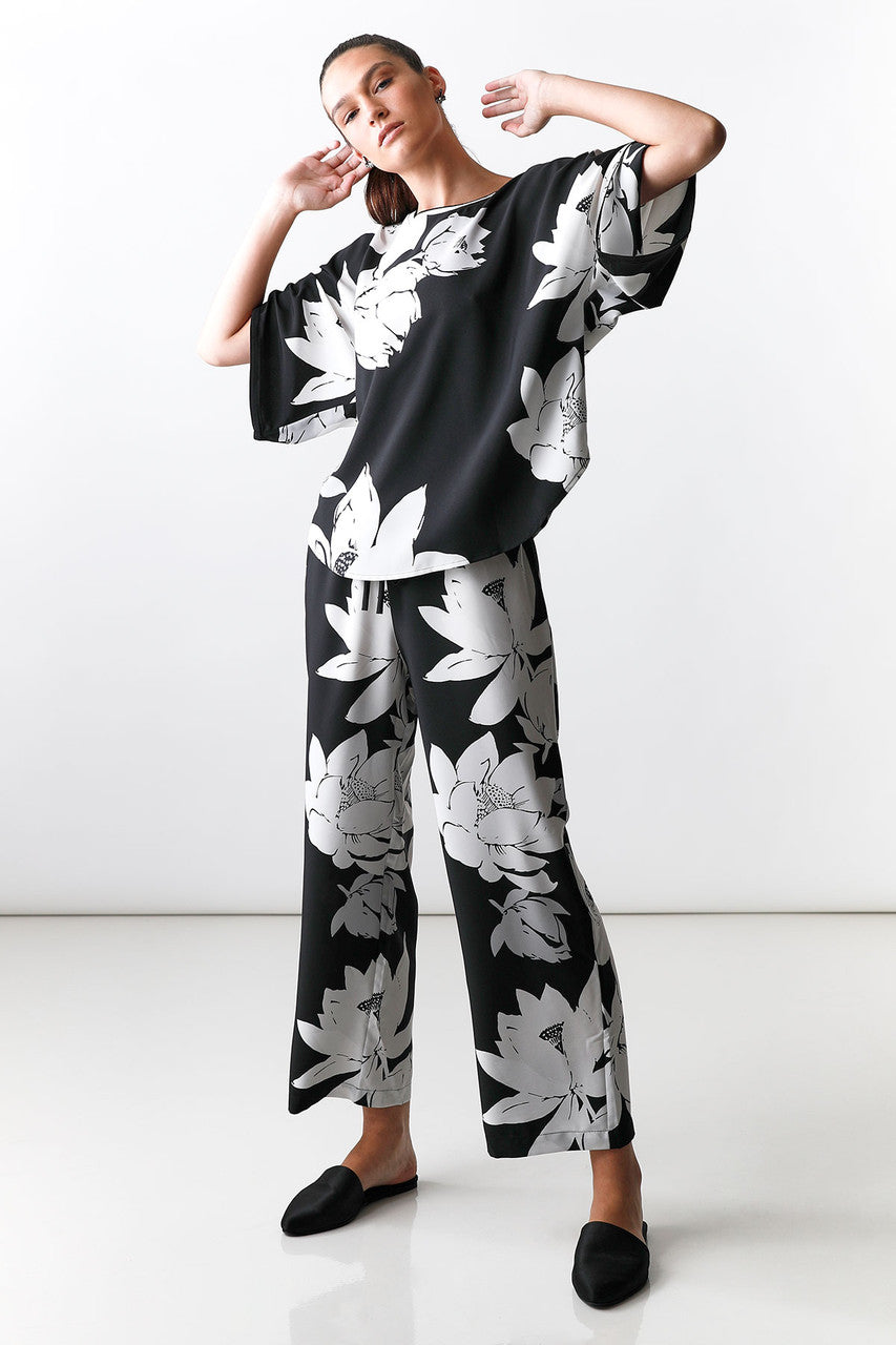 Crepe de chine, matte fabric. Lightweight, comfortable and cooling to wear for the spring and summer. Fluid drape, smooth feel with grainy texture.