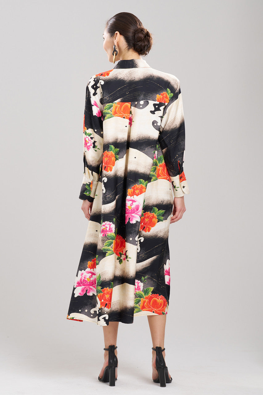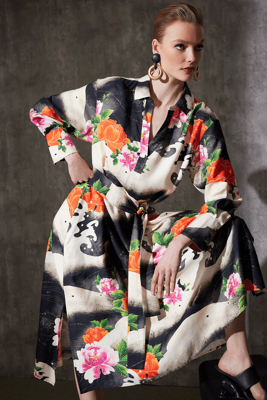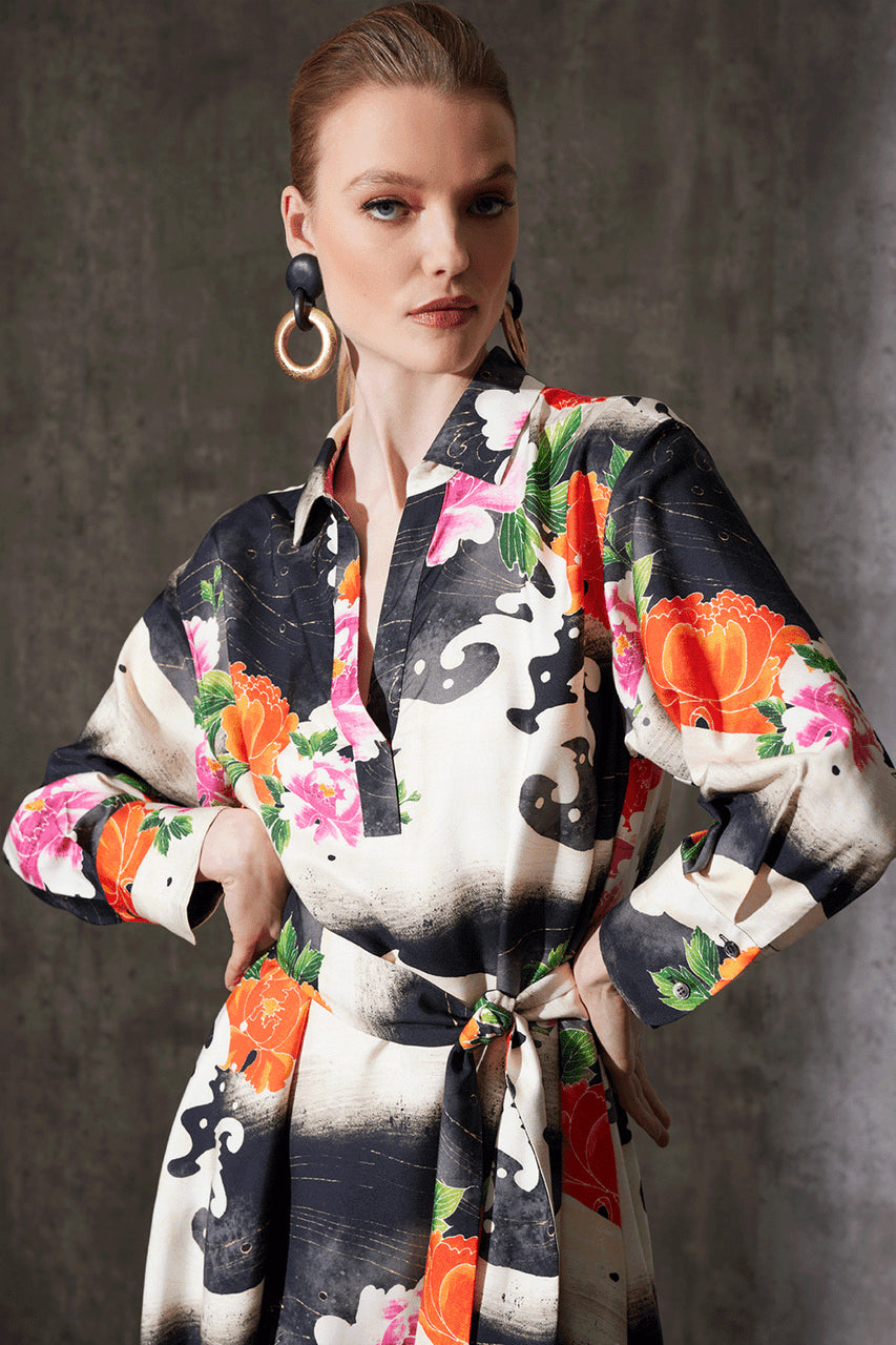 Mayumi Cotton Silk Oversized Half Placket Shirtdress - black multi