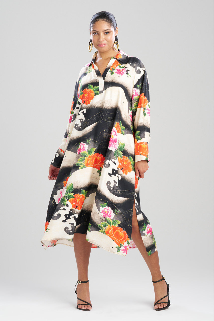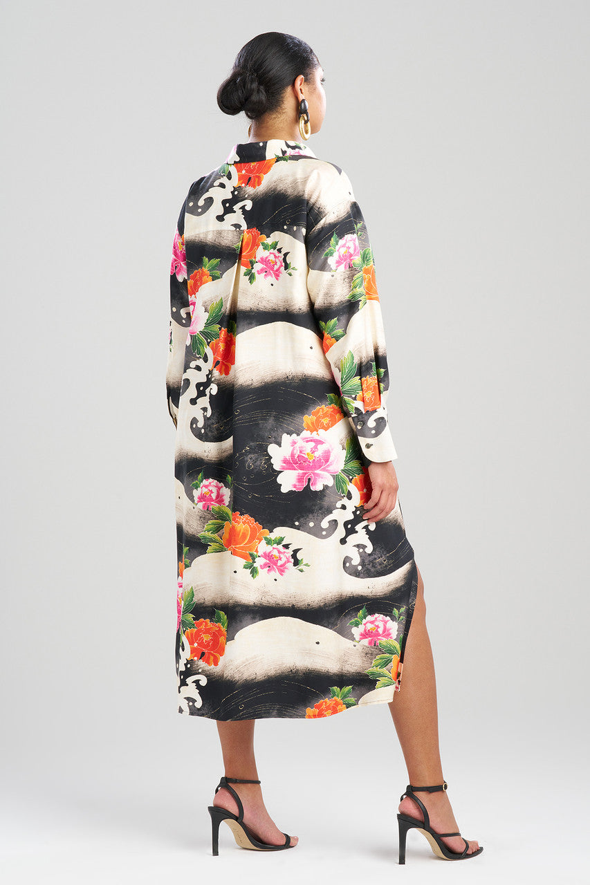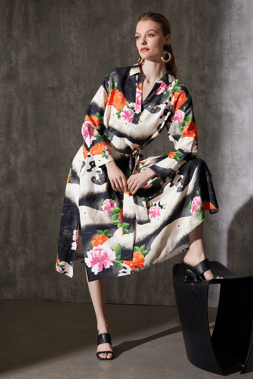 Mayumi Cotton Silk Oversized Half Placket Shirtdress - black multi