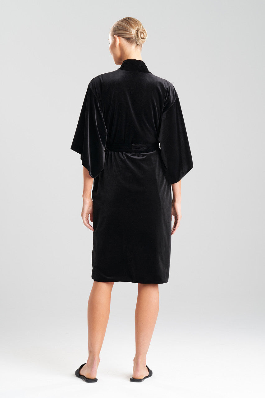 - Relaxed robe with self tie belt and pockets, a beautiful and unique applique on the sleeve and wearers bottom left