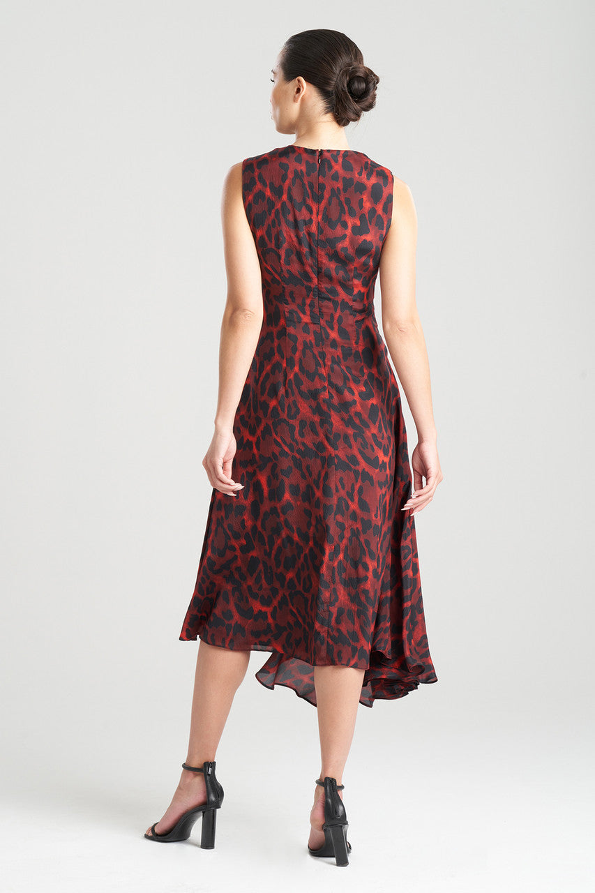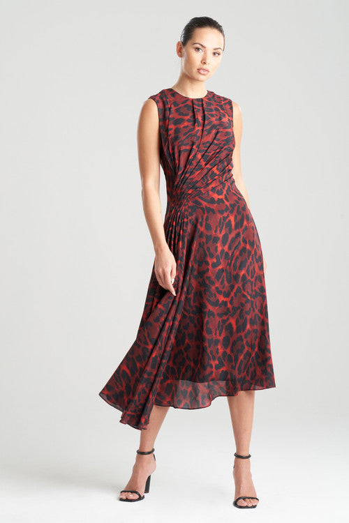 - Chic dress with side pleat detailing that flares out towards wearer's right side and has an asymmetrical hem