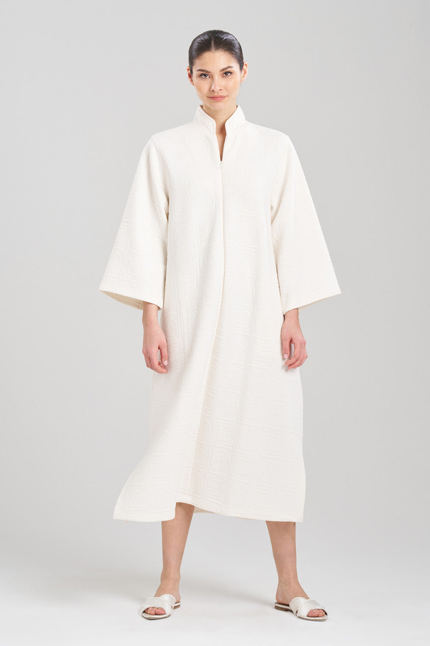 - Relaxed and comfortable lounger with zipper at center front for closure, side pockets and side slits at bottom hem