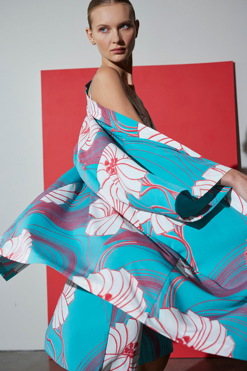 Crepe de chine fabric. Lightweight, comfortable and cooling to wear for the spring and summer. Fluid drape, smooth feel with grainy texture. The matte fabric gives a modern feeling to the prints. Wrinkle resistant.