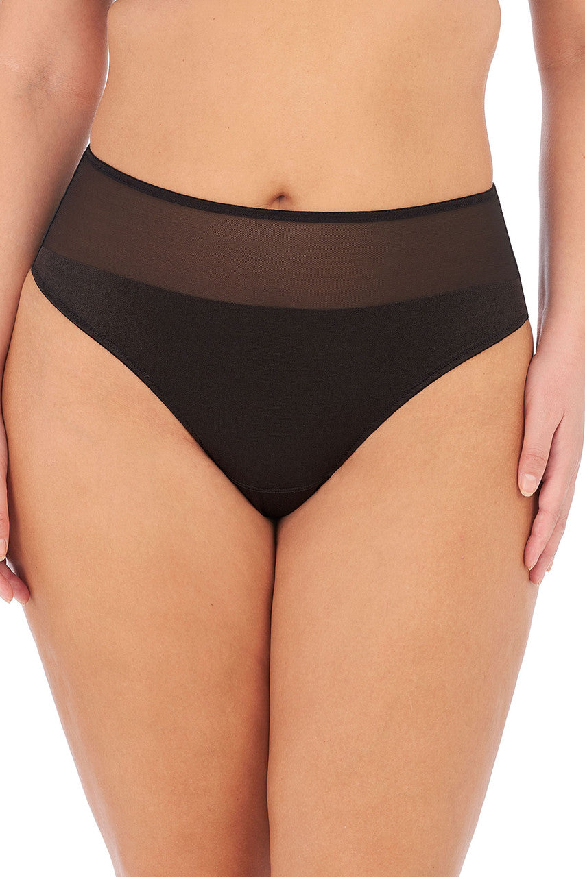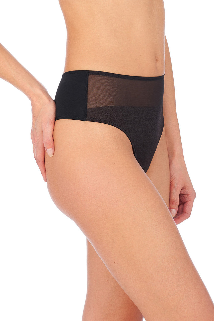 High rise thong crafted with sheer mesh and sleek fabric, for a flattering, comfortable fit that looks just as good as it feels.