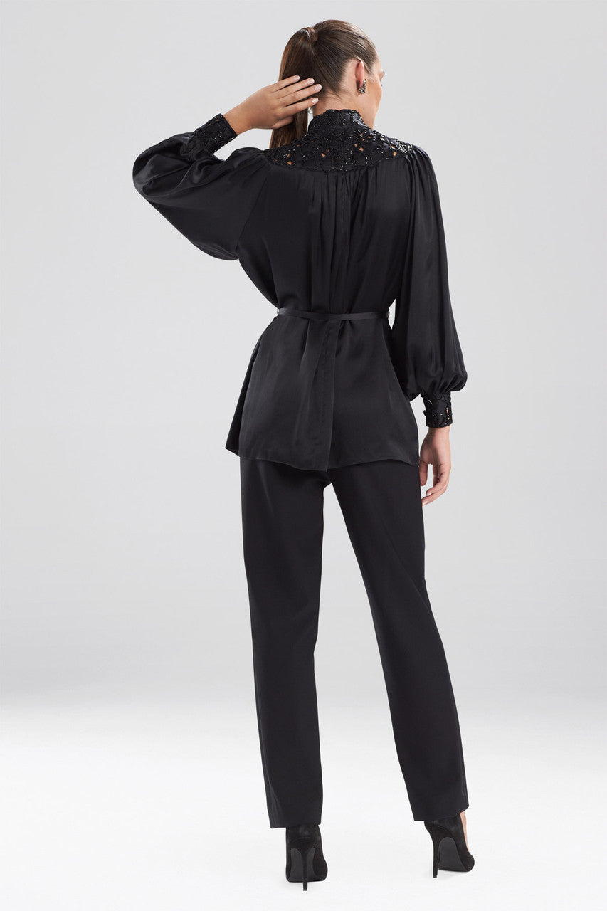 Details & Care For Solid Silk Charm Tie-Front Embroidered Top