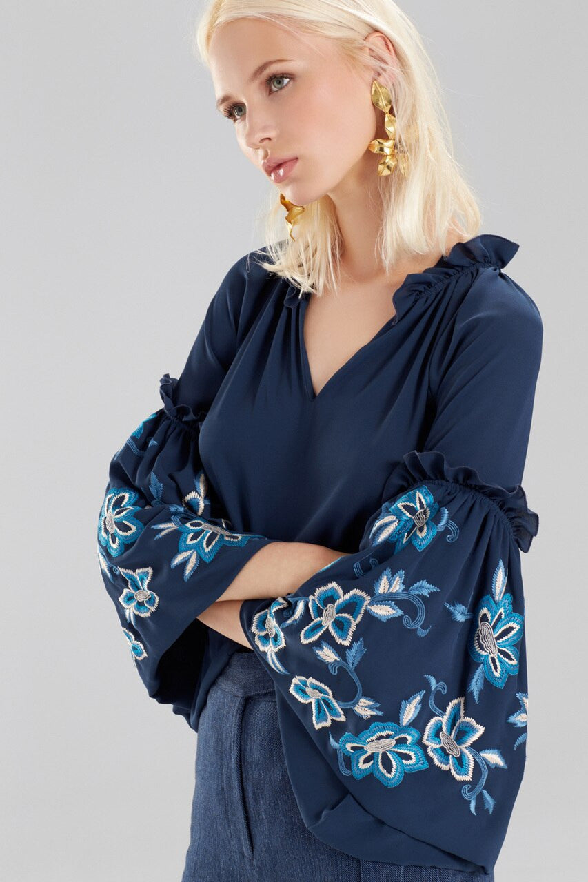 Solid Silky Soft Peasant Top With Embroidery - blue spruce