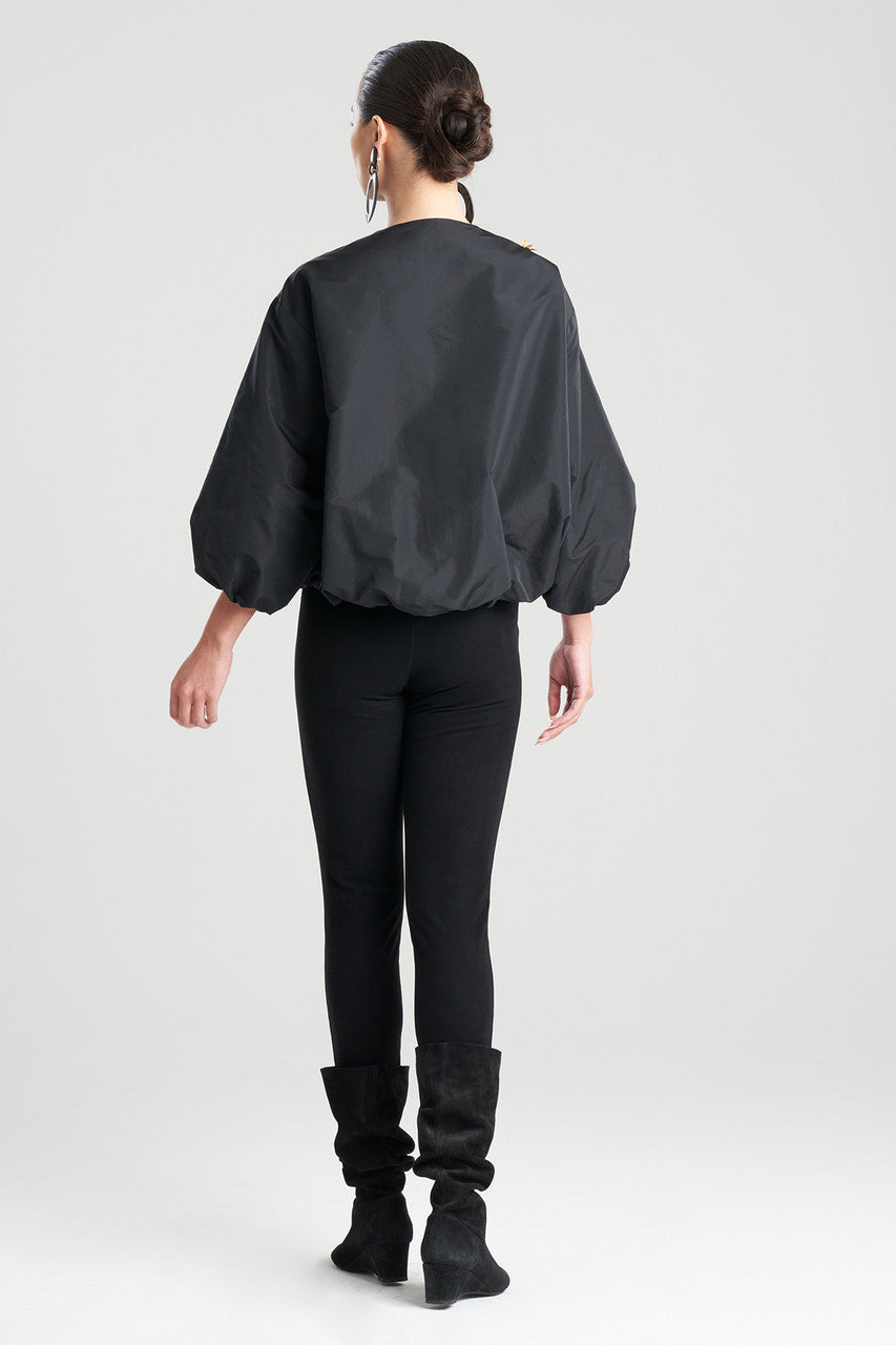 Crisp and lustrous fabric from Italy. A lightweight balloon sleeve bomber that holds it shape.