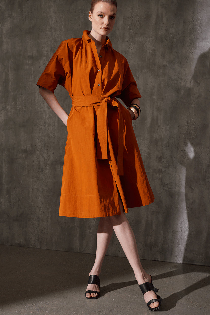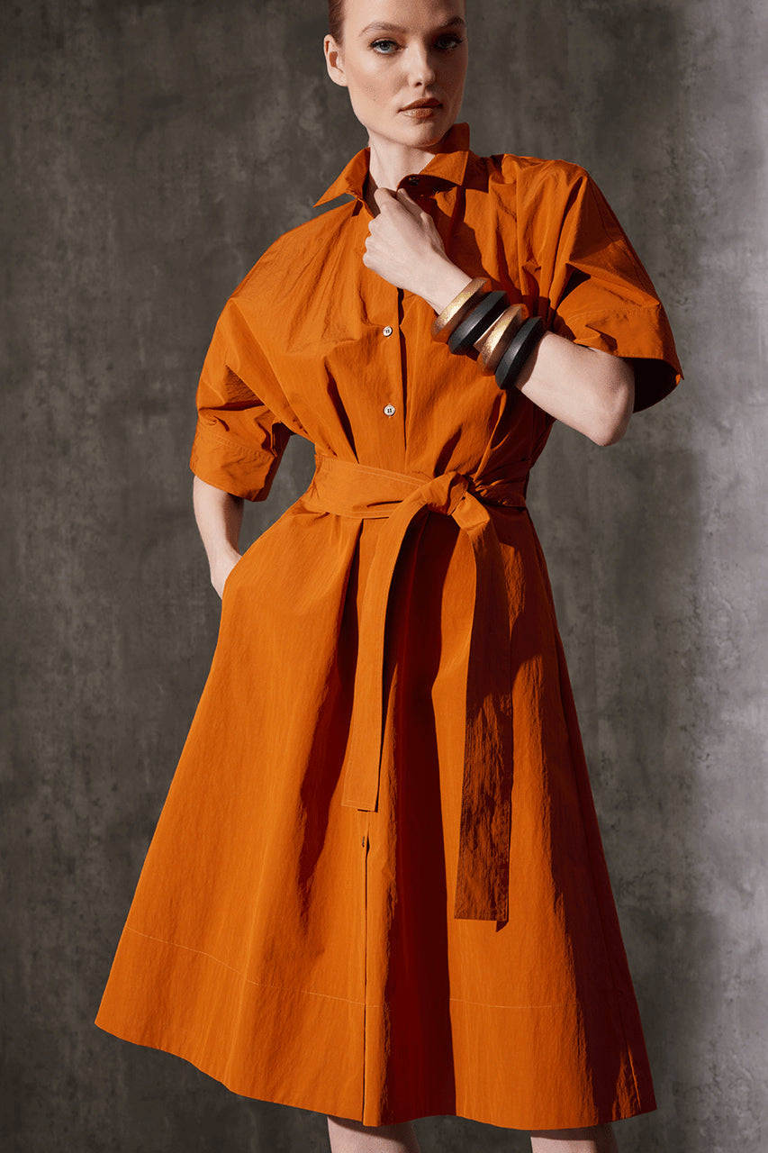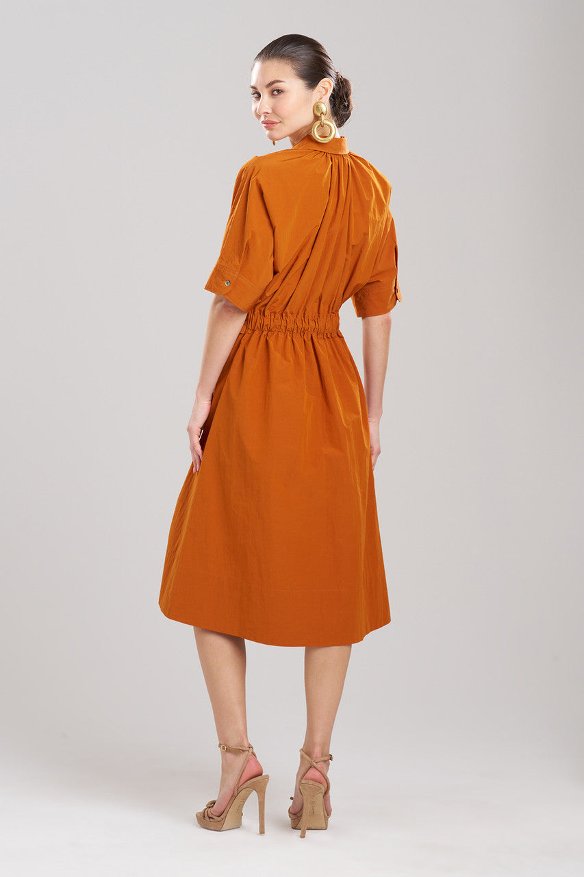 - Classic button down shirtdress with a self tie waist and soft elastic on the back to accentuate your waist