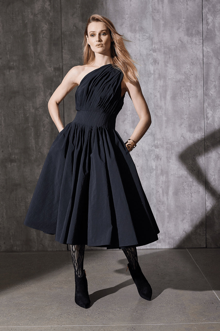 - A-line dress, one shoulder, pleated detailing, invisible zipper