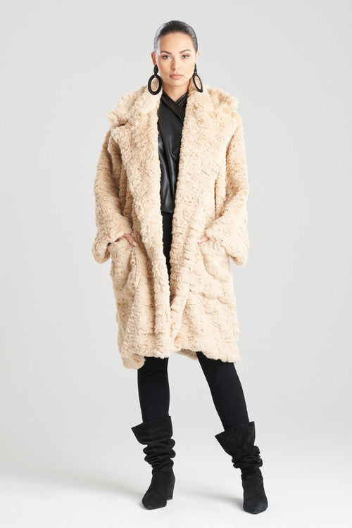 Textured Faux Fur Collared Long Coat - natural