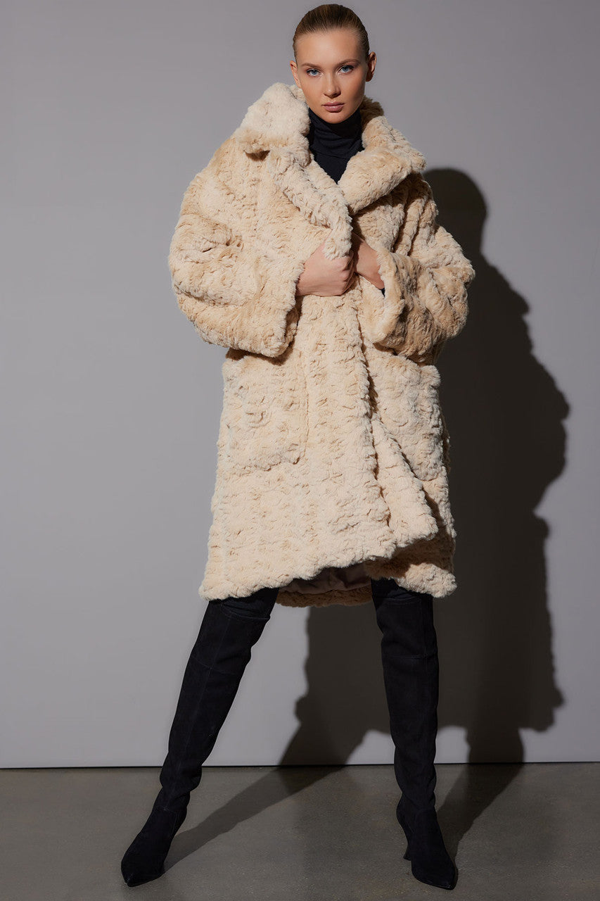 - Knee length textured faux fur with exaggerated collar and front patch pockets