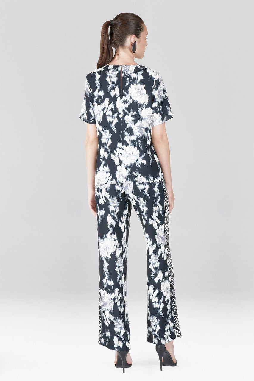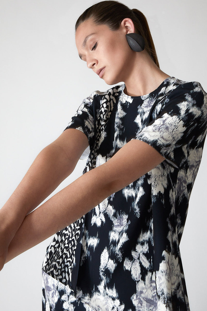 Tie-Dye Floral Fluid Crepe Asymmetrical Hem Top - black with white