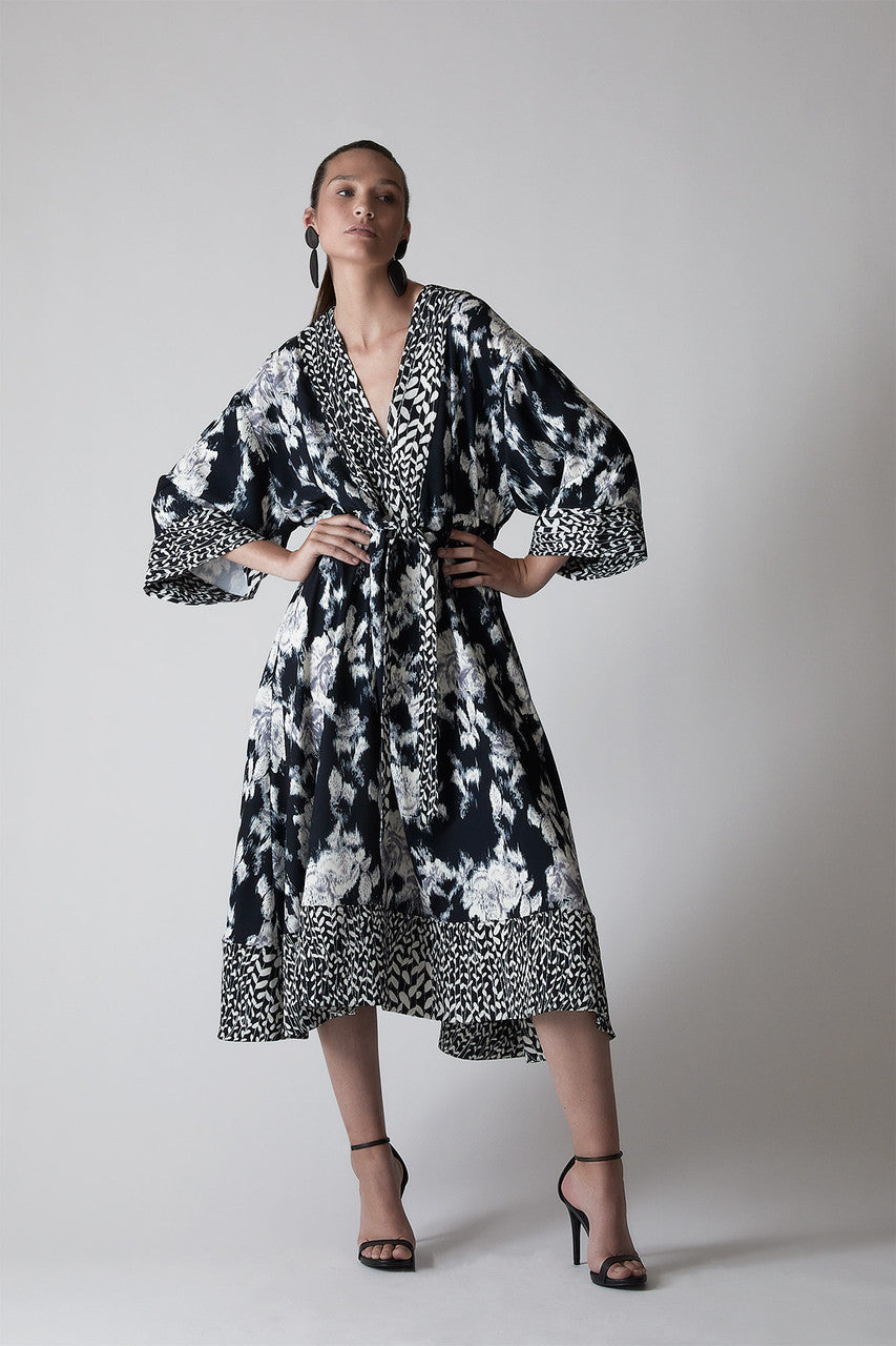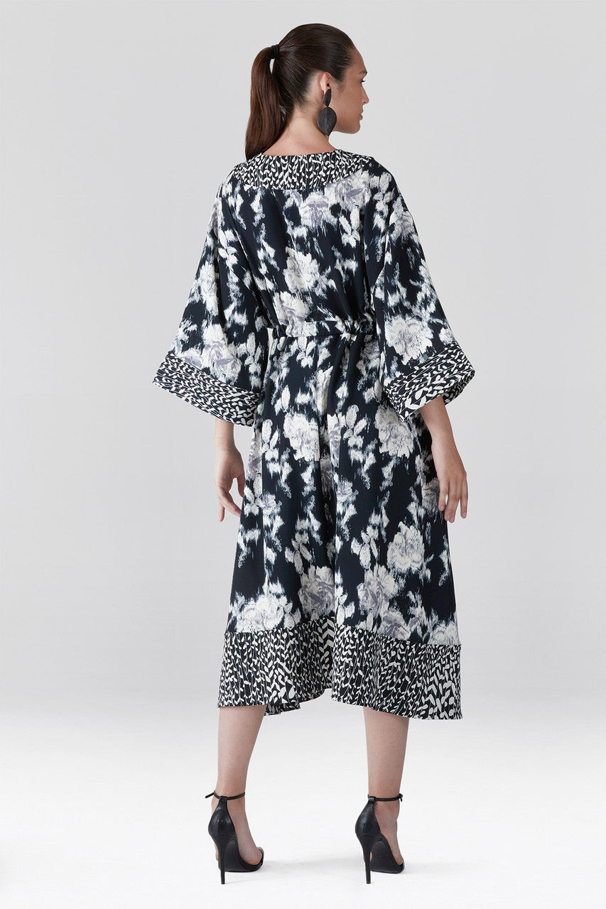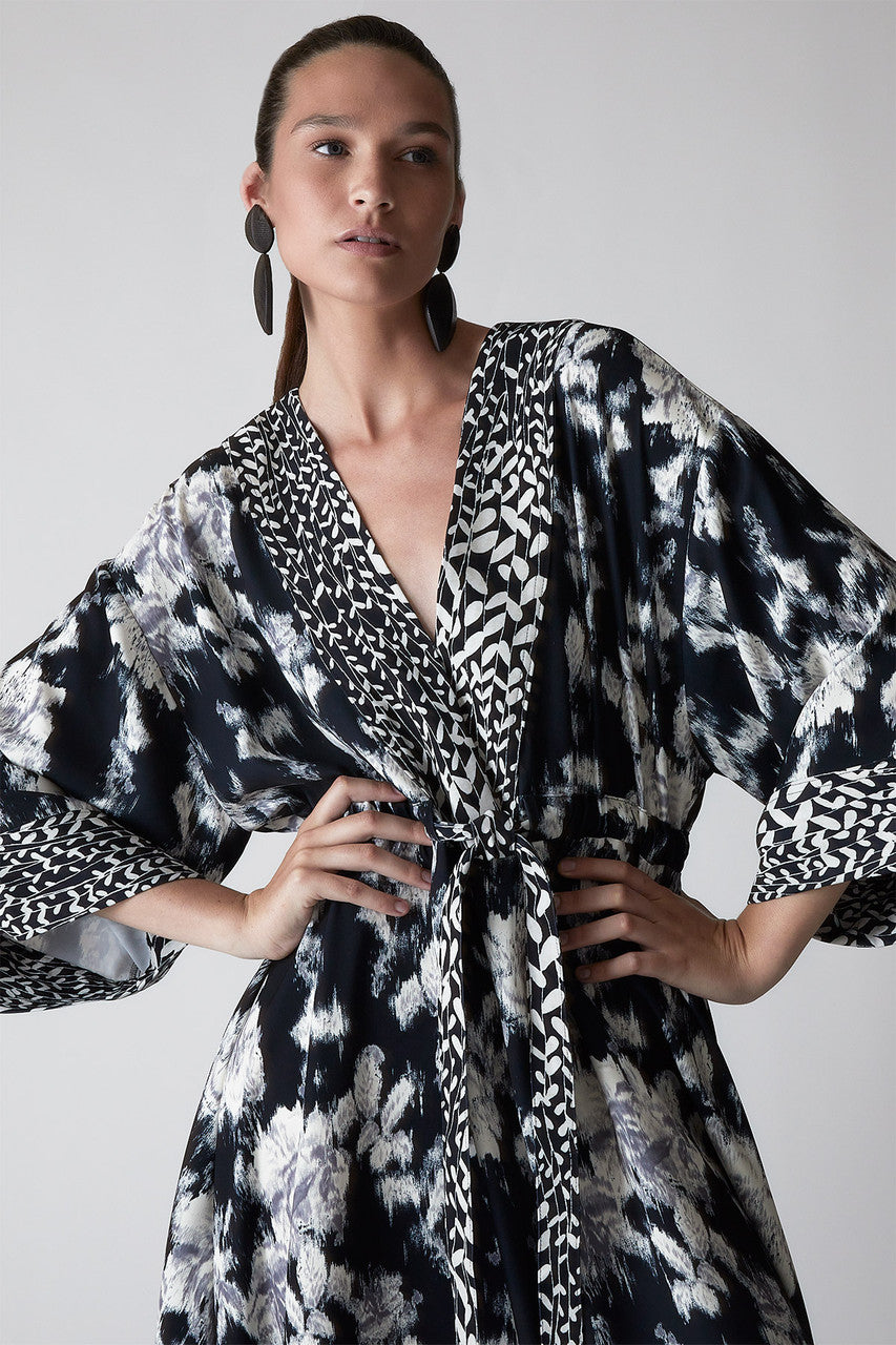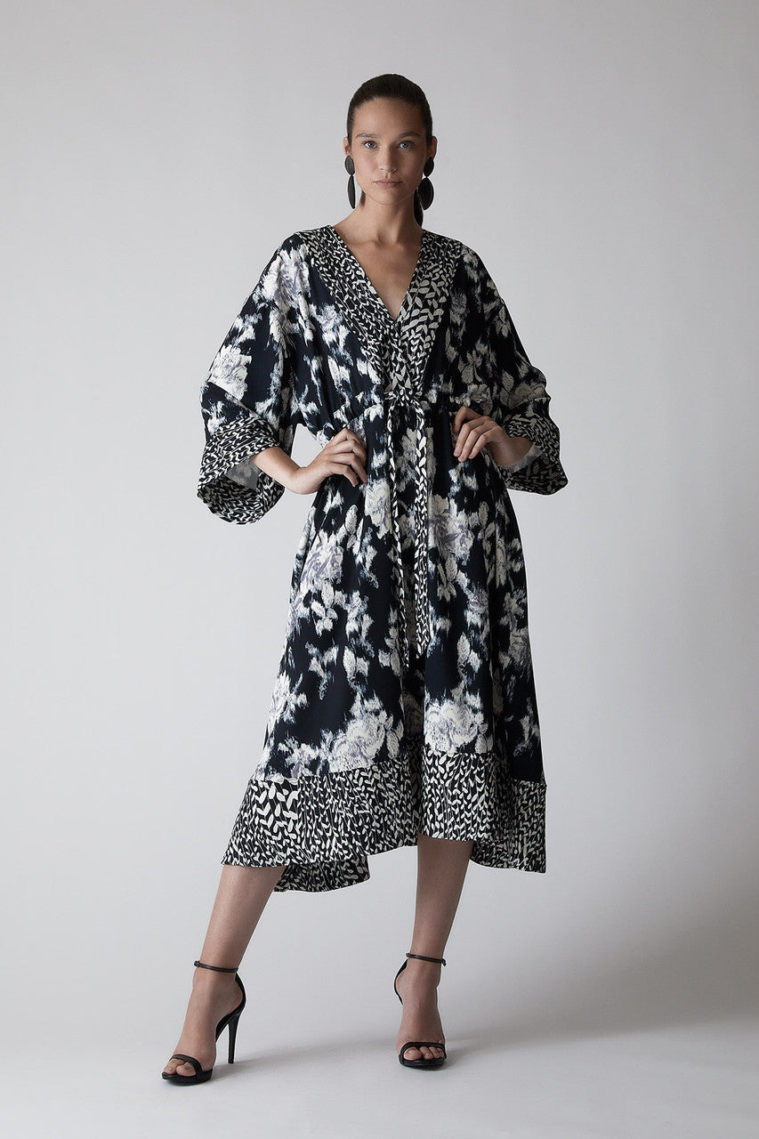 Tie-Dye Floral - Fluid Crepe Kimono Dress - black with white