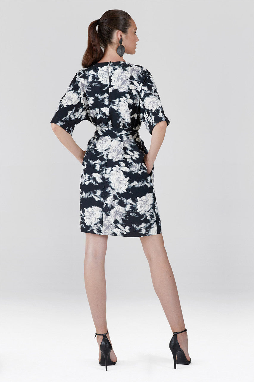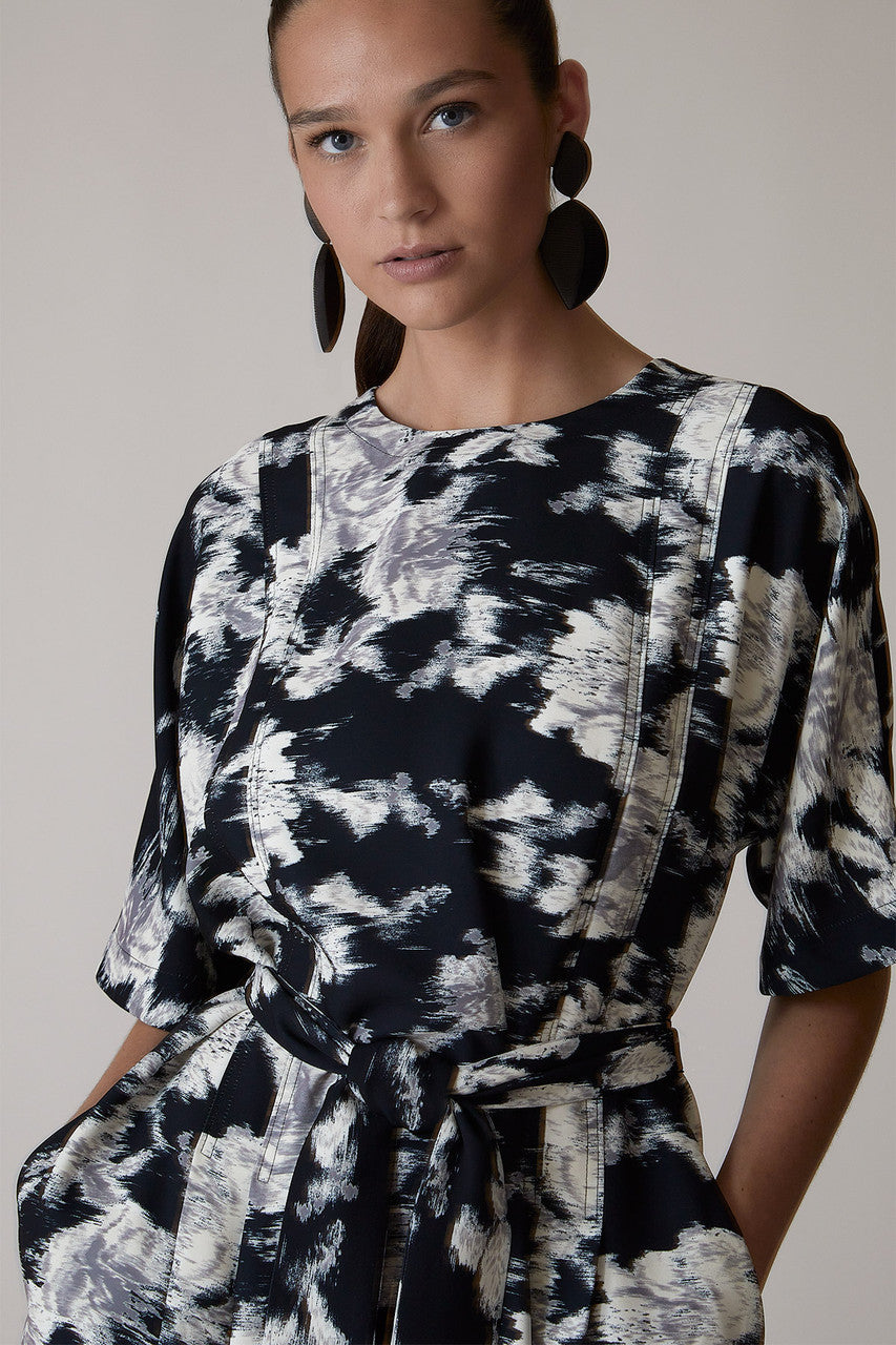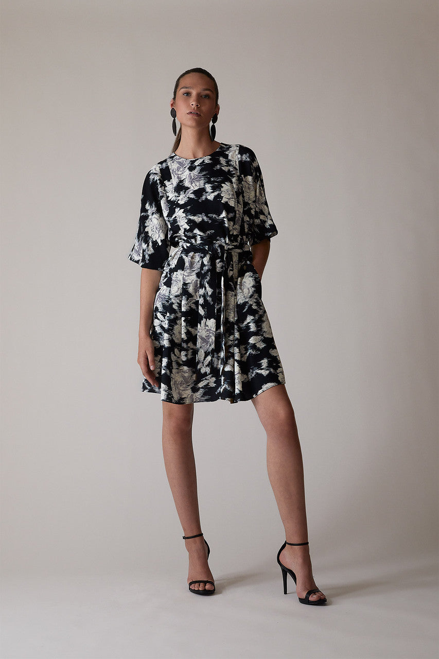 Tie-Dye Floral - Fluid Crepe Pleated Dress - black with white