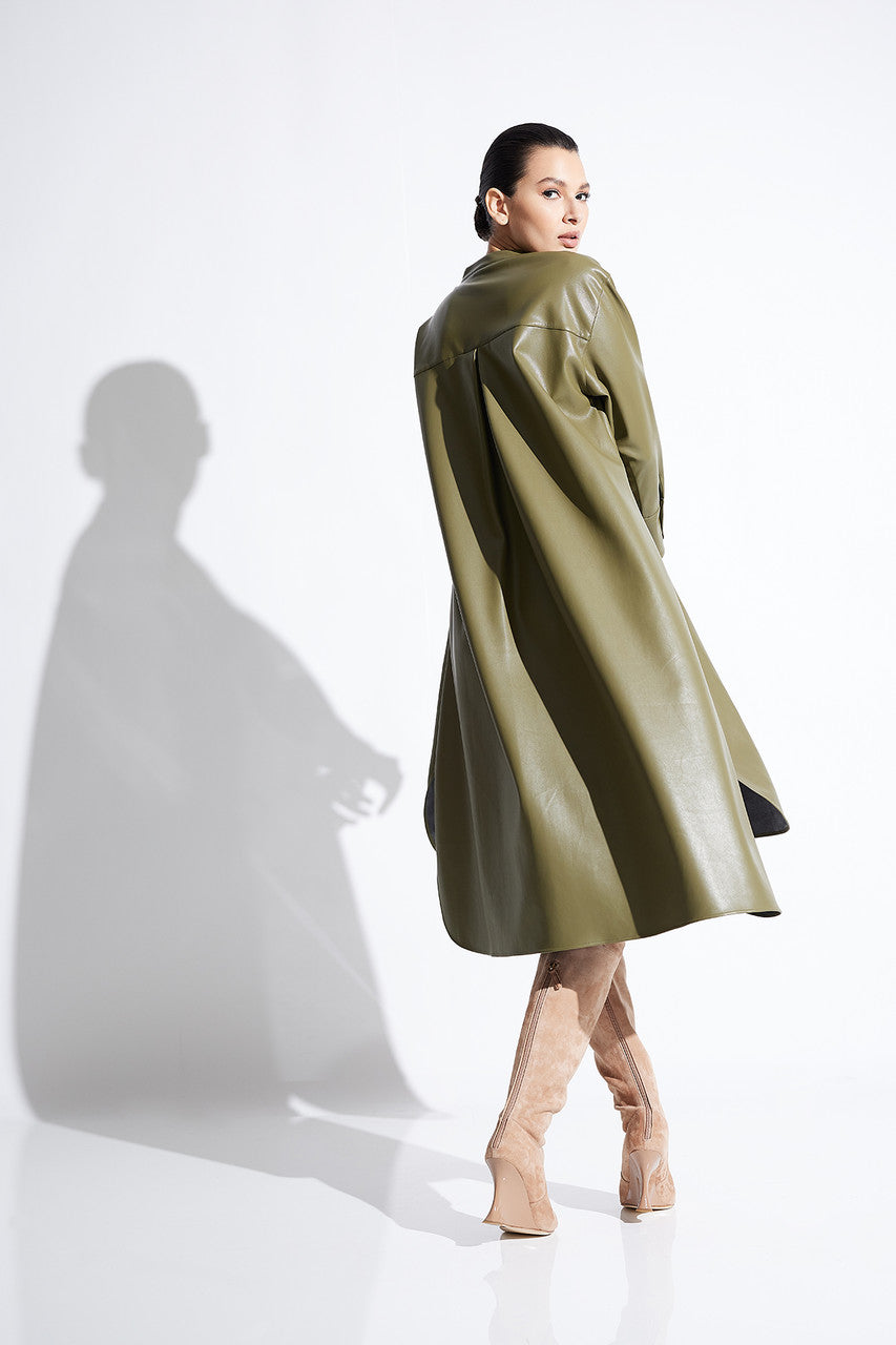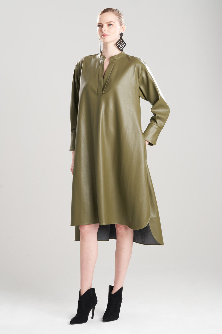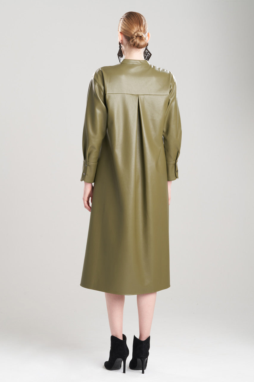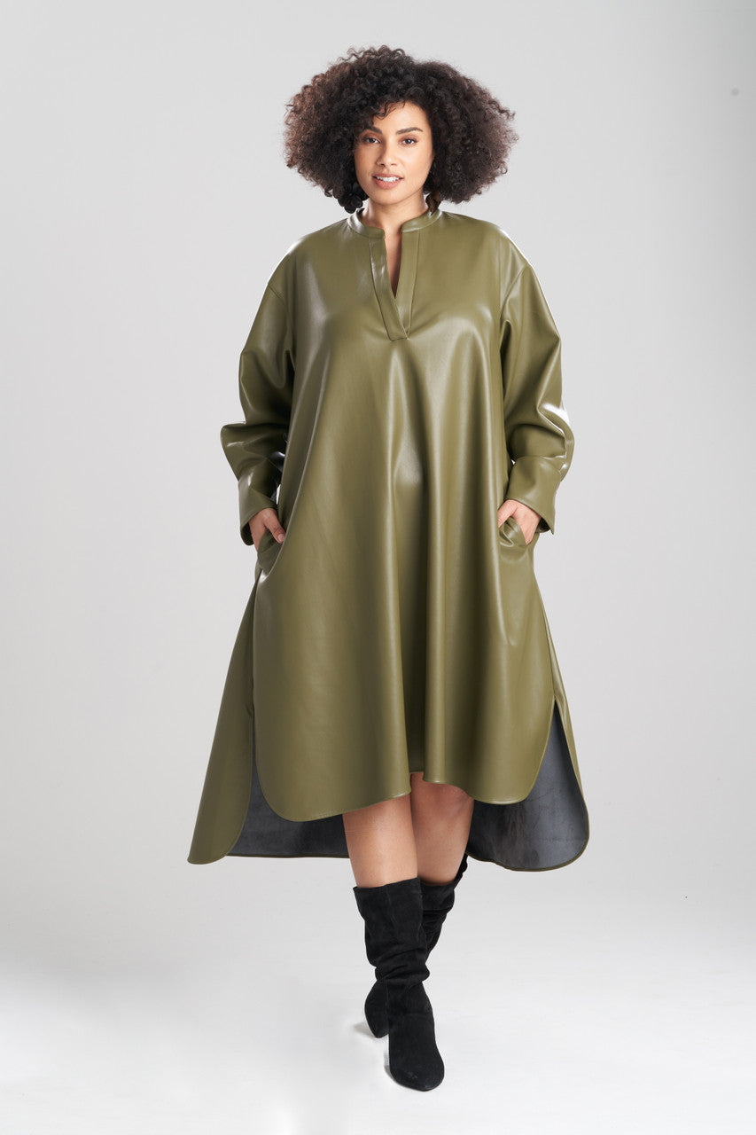 Vegan Luxe Leather Oversized Half Placket Shirtdress - olive